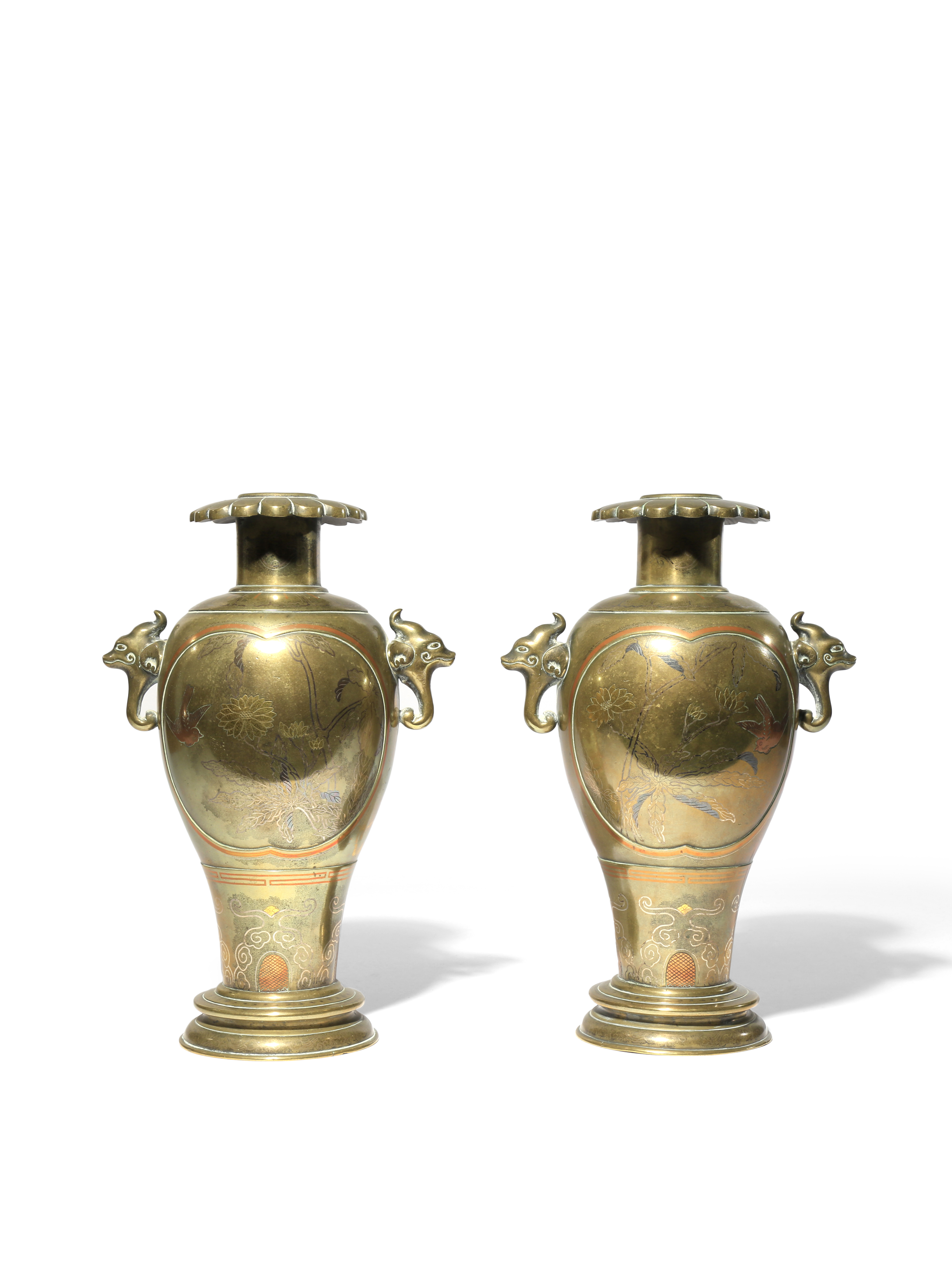 A PAIR OF JAPANESE MIXED METAL VASES MEIJI 1868-1912 The tall baluster bodies decorated with two...