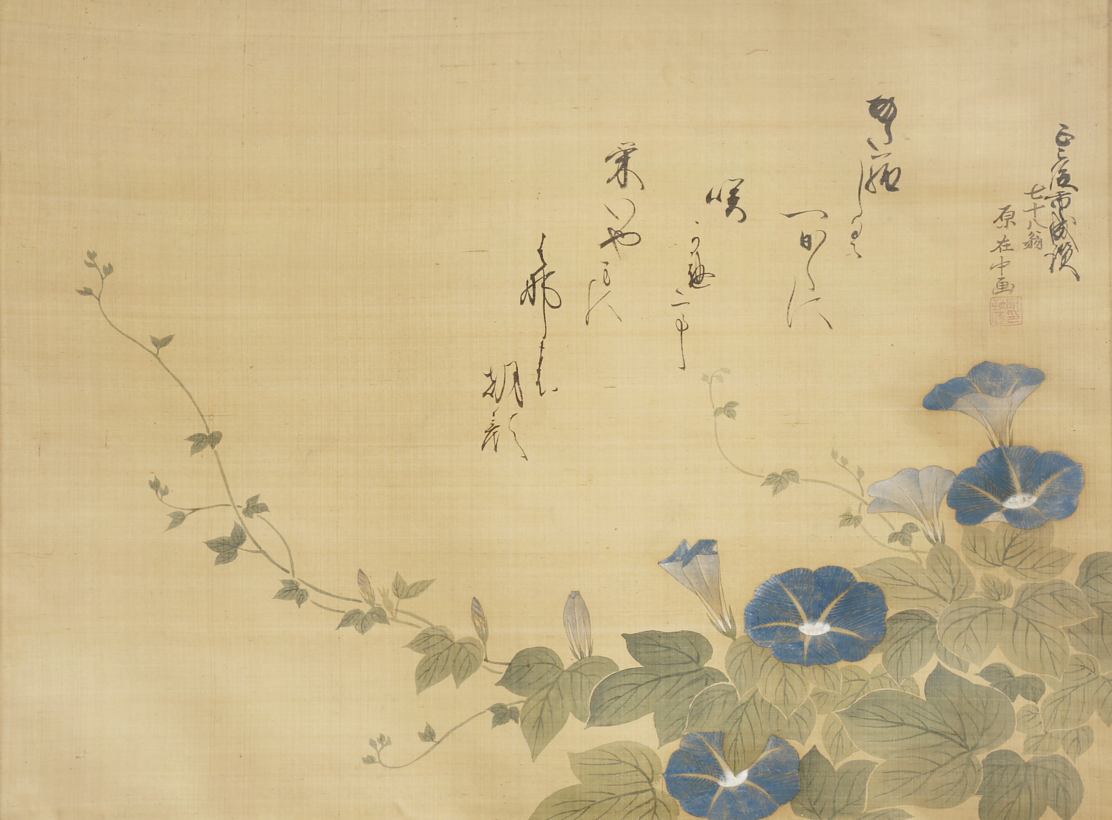 In ink and colour on silk, finely painted with a flowering shrub of morning glory, asagao, with scrolling tendrils extending to the side, with calligraphy above reading nanaju-hachi o (old man of seventy-eight years), Hara zaichu ga (made by Hara Zaichu) and Ichinari san, 51.5cm x 38.5cm.