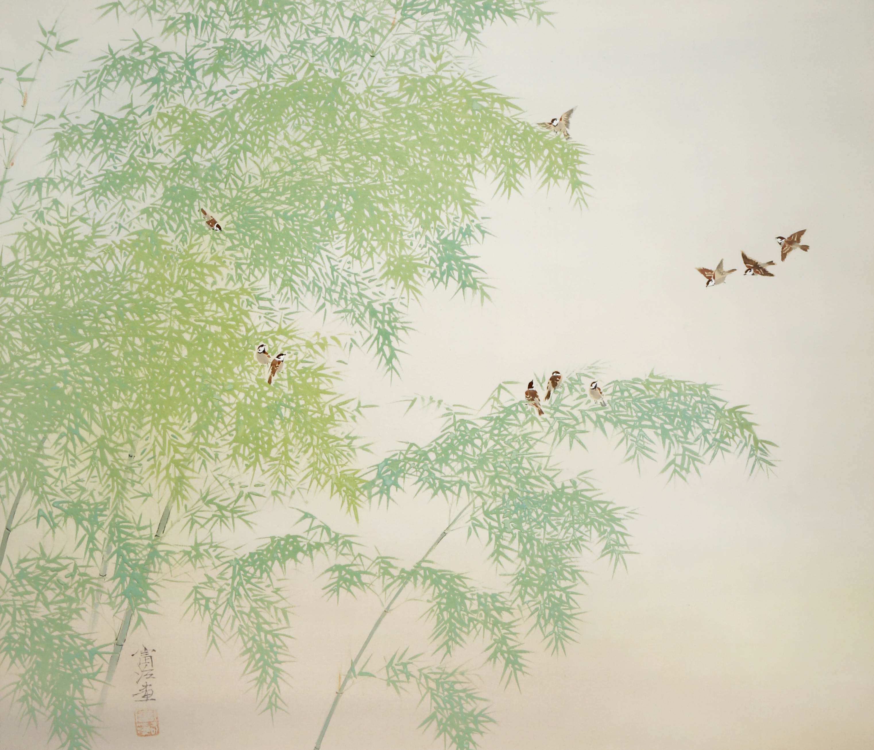 In ink and colour on silk and depicting many sparrows, some in flight and others perched in leafy branches of bamboo, with a two character signature and a red seal mark, together with a tomobako wood box, 50.5cm x 43cm. (3)