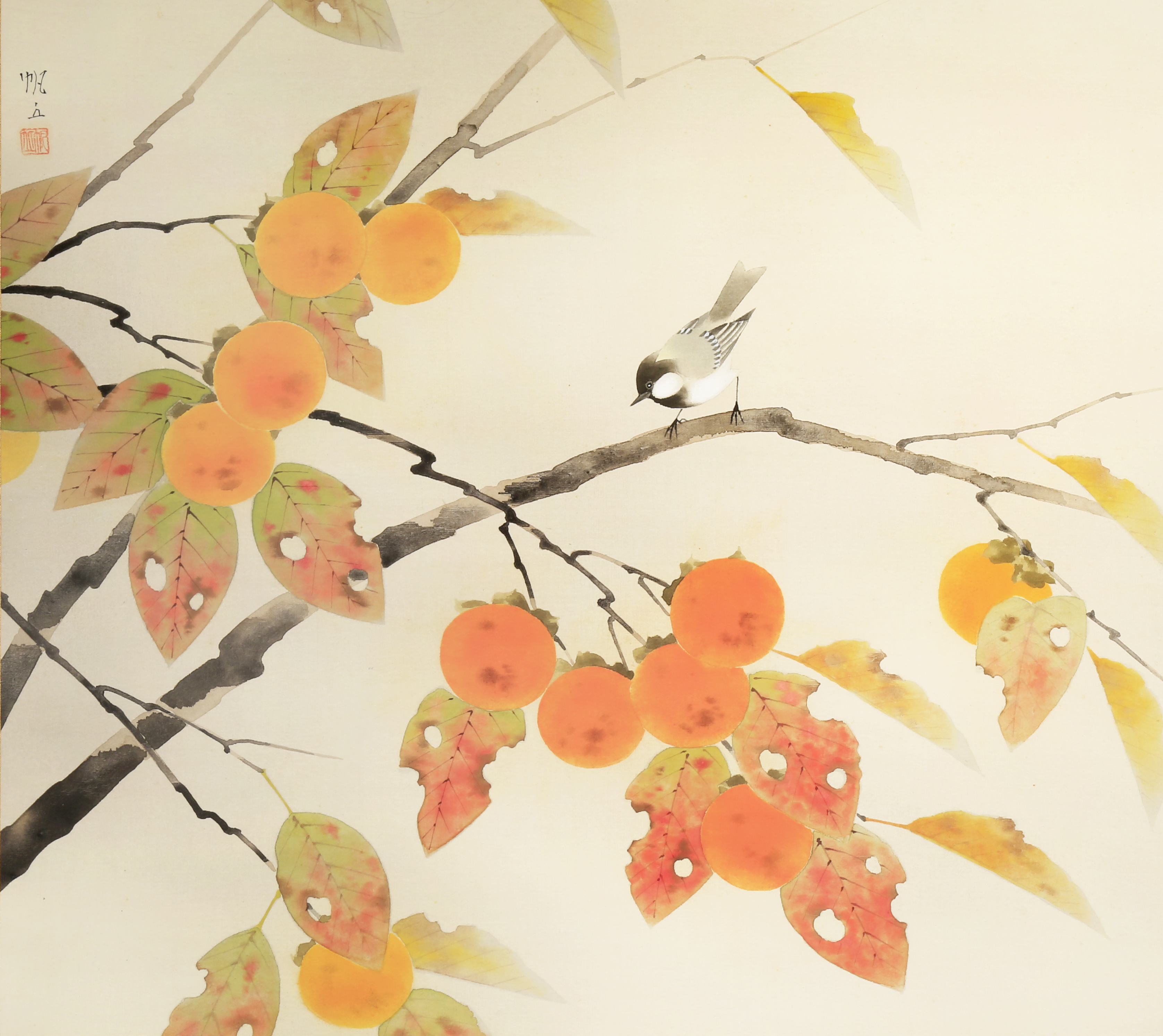 In ink and colour on silk, depicting a small tit perched on a fruiting branch of persimmon, kaki, with a two character signature to the left and a red seal mark, together with a tomobako wood box, 49.7cm x 44.5cm. (3)