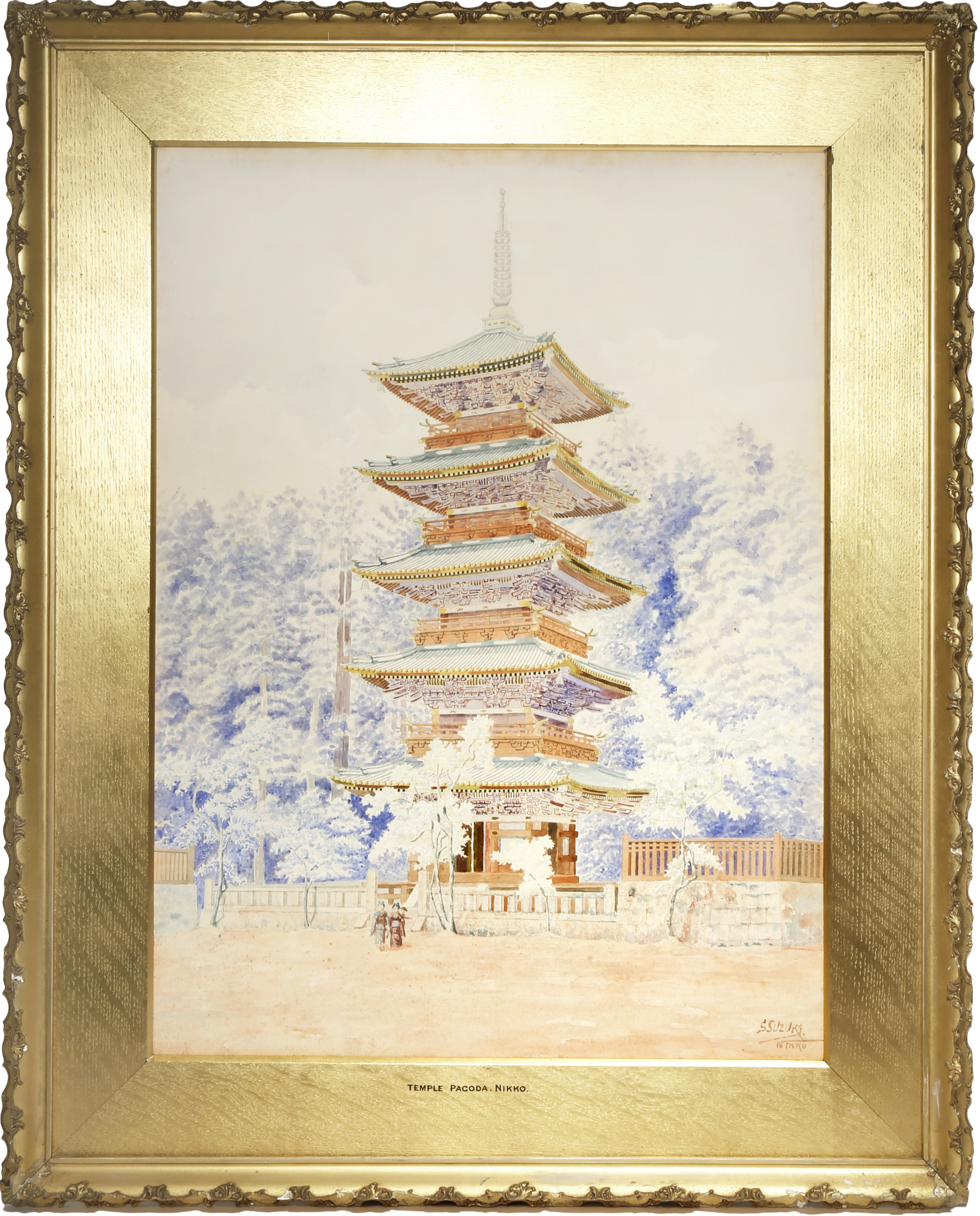 Depicting figures standing before the five-storey pagoda at the Tosho-gu Shinto shrine in Nikko, with traces of pencil and signed S.Suzuki Nikko, a paper label for Grundy & Smith Manchester to the back, framed, 67cm x 48.5cm.