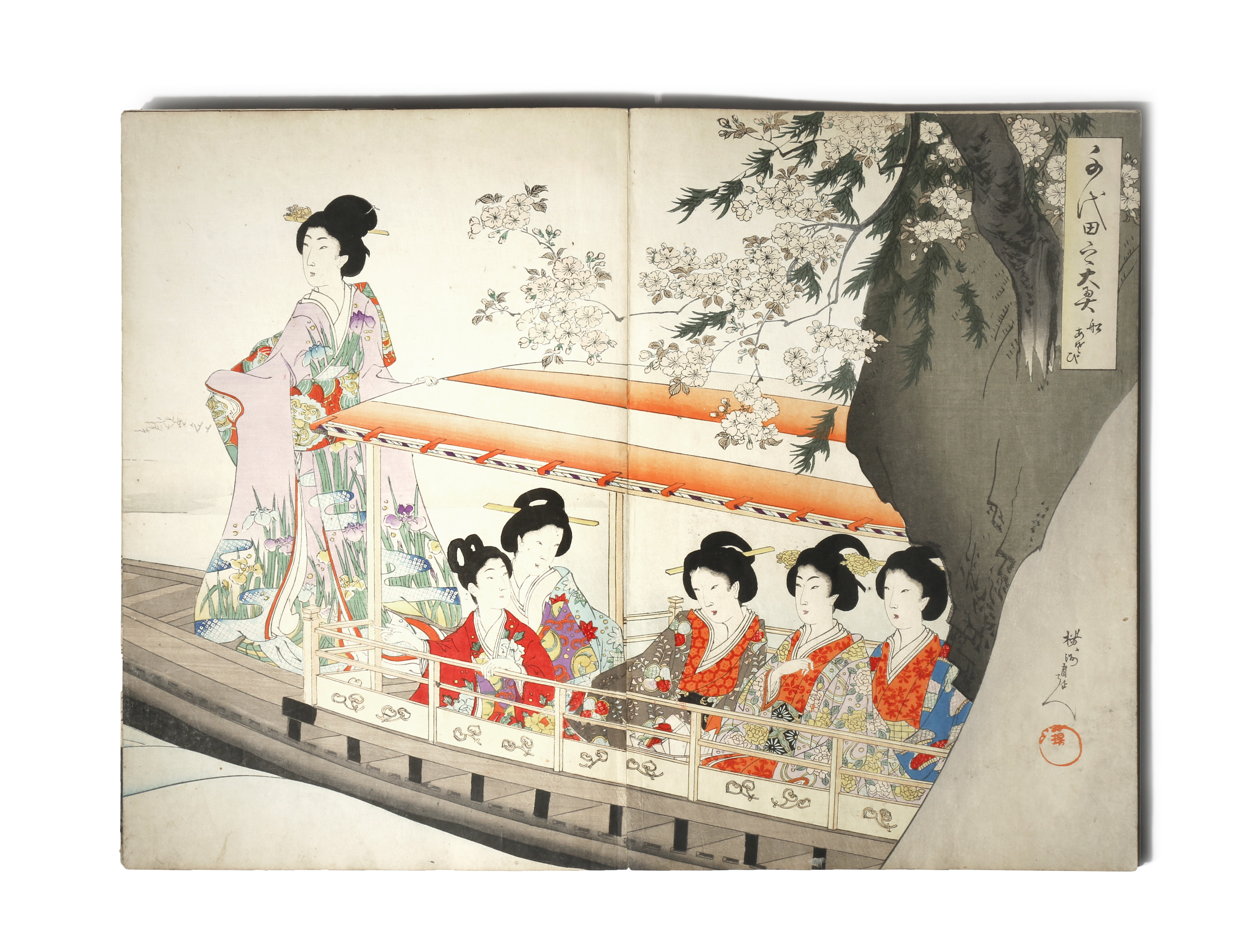 Entitled Chiyoda Castle / Album of Women and including both diptychs and triptychs, the prints depicting beauties in various settings and scenes of life at court, most signed Toyo Chikanobu, the album 35.2cm x 23.5cm.