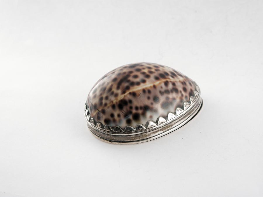 A George III mounted cowrie shell snuff box, with a plain cover and a concealed hinge, initialled "WB", by Joseph Wilmore 1810, 2.75in (7cm) long.