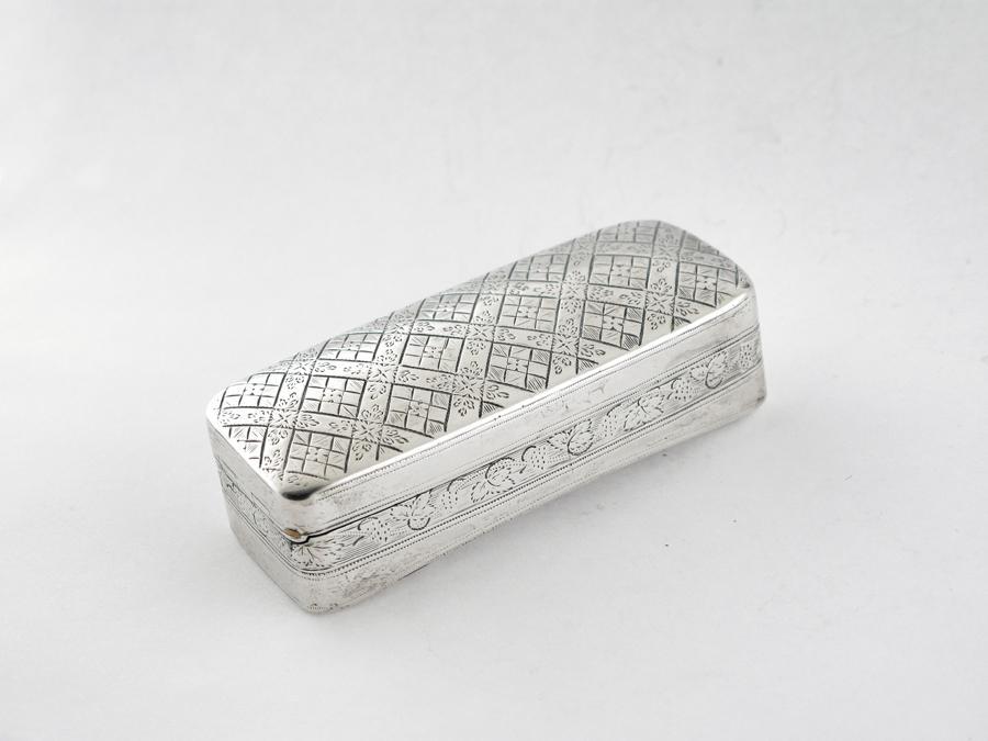 A George III oblong snuff box, curved on the base to fit the pocket, engraved top and bottom with a latticework of ribbons, the cover hinging at one end, gilt interior, no apparent maker's mark, London 1801, 3.25in (8.3cm) long, 2oz.