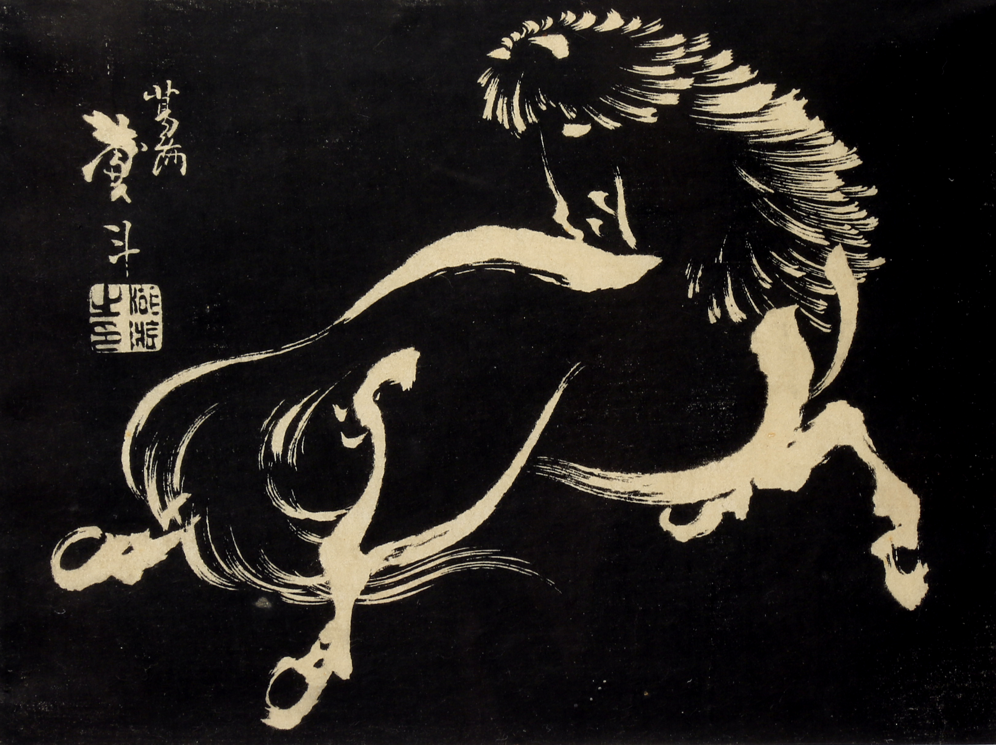 One depicting a galloping horse in white reserve on a deep black ground, with signature and seal to the side, the other of the fight between Benkei and Tosa Bo Shoshiun, the picture of the two figures with a paper label reading 'Coll. Barboteau, sale 1908, no.269', both in modern frames and glazed, 17cm x 23.5cm and 32cm x 22cm respectively.