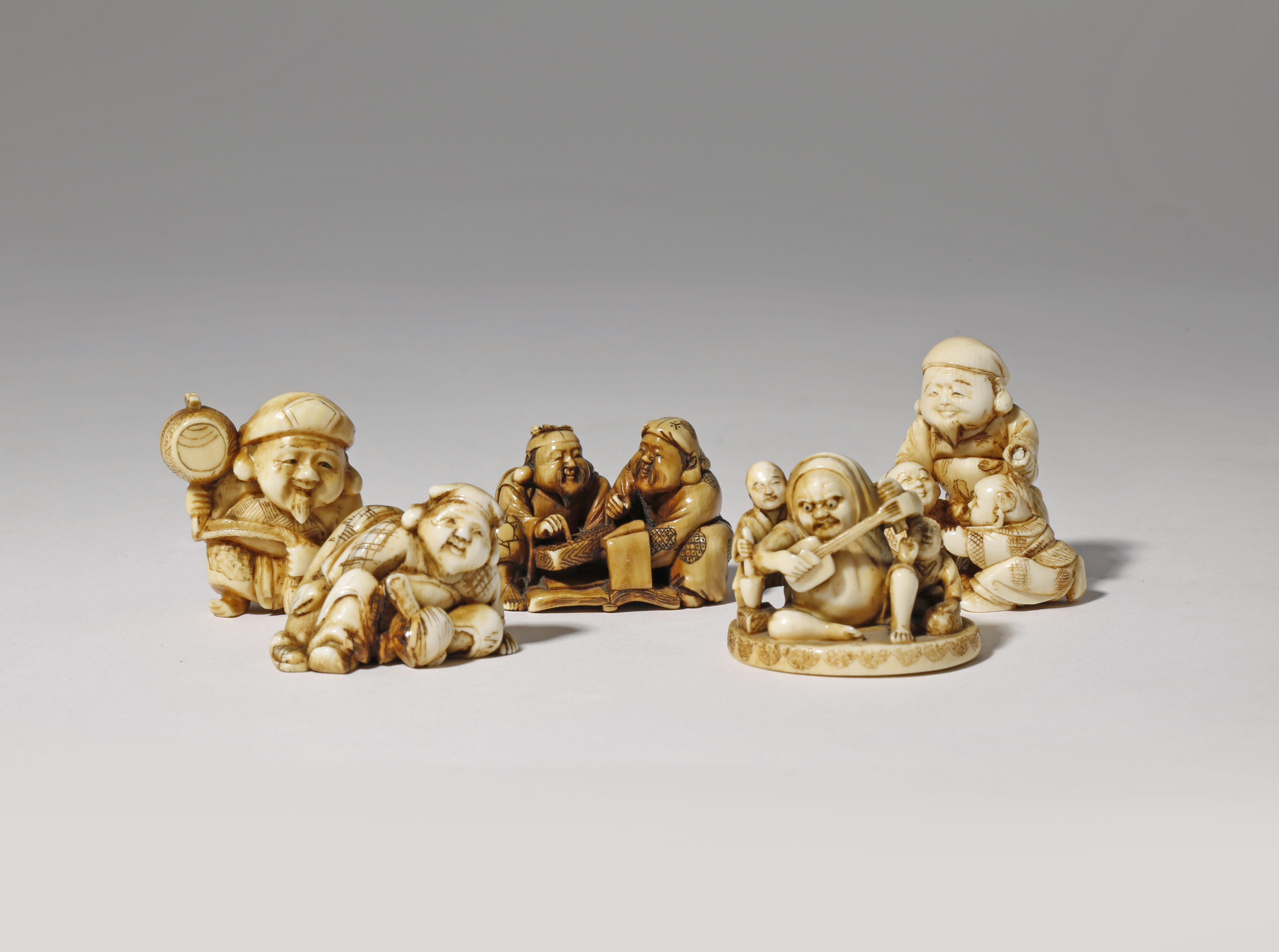 λ FIVE JAPANESE IVORY NETSUKE MEIJI 1868-1912 Four of them depicting Gods of Good Fortune (Ebisu...