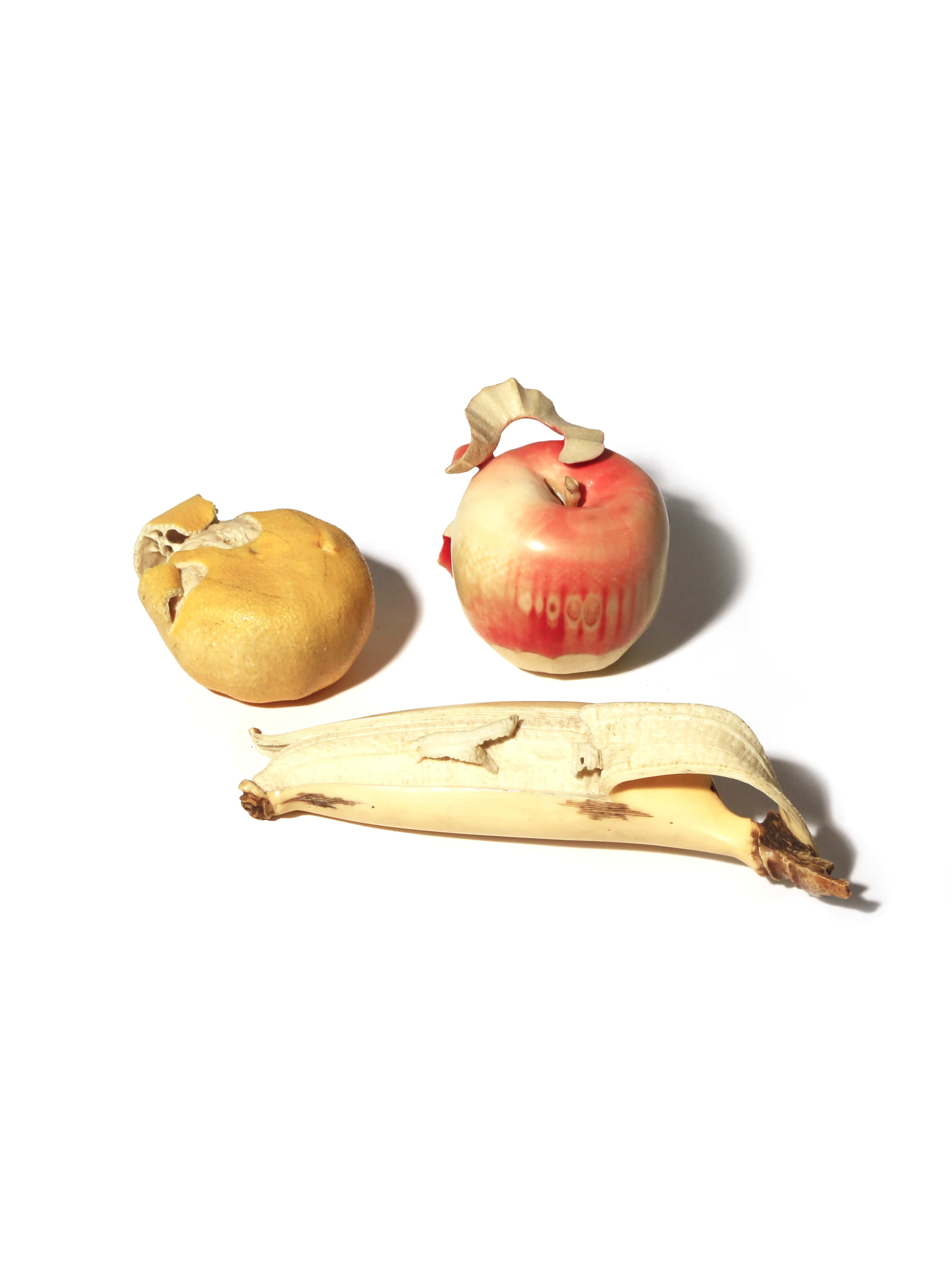 Carved as an apple, a tangerine and a banana, all with their skins partially peeled to reveal the flesh underneath, stained with naturalistic colours and with details realistically rendered, 14.3cm max. (3)
