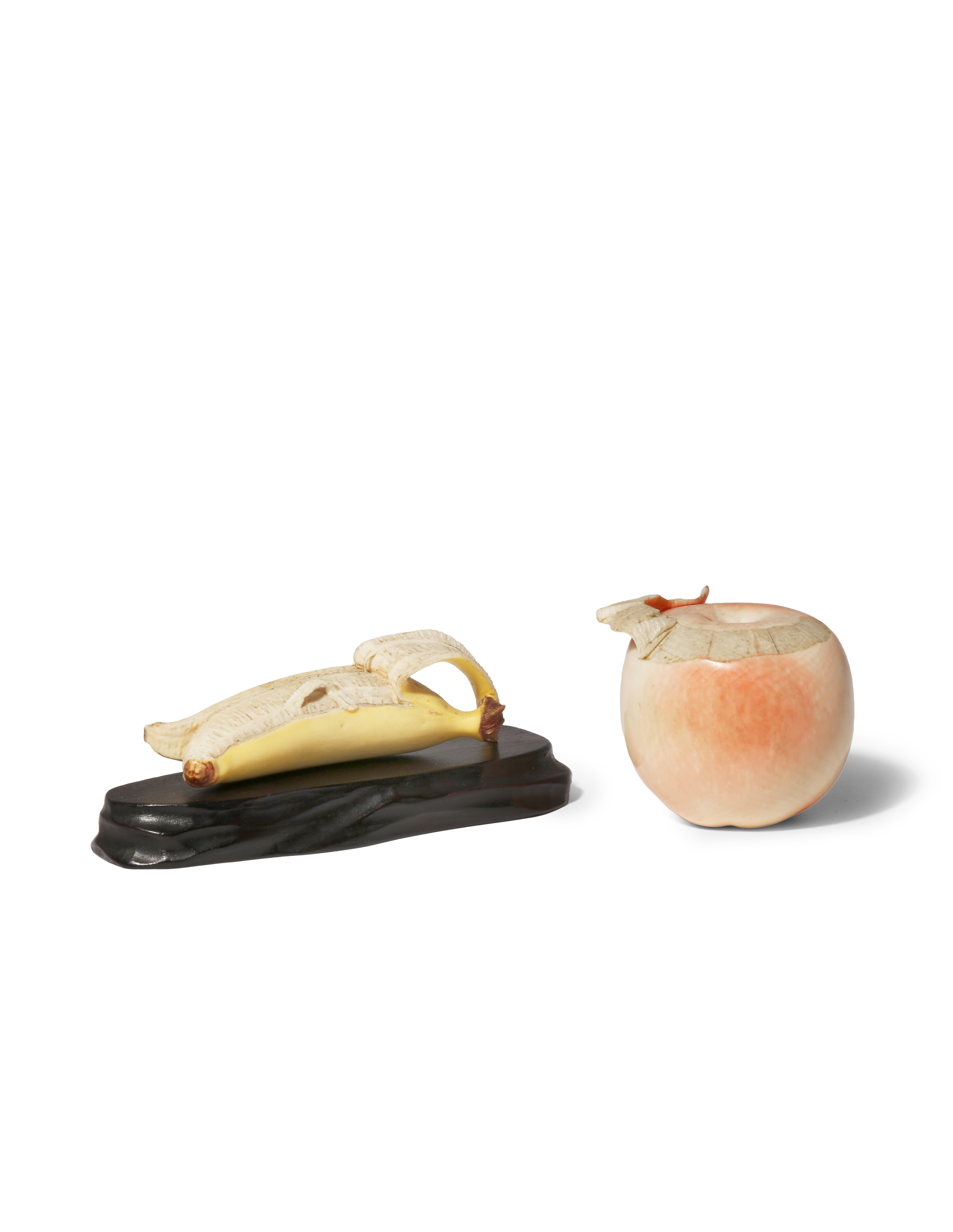 One depicting an apple with its skin partially peeled, the surface stained in a light blush pink, the other a banana with its skin also peeled back to the stalk, revealing the flesh underneath, with an associated wood stand, the fruits 6cm and 9.5cm respectively. (2)
