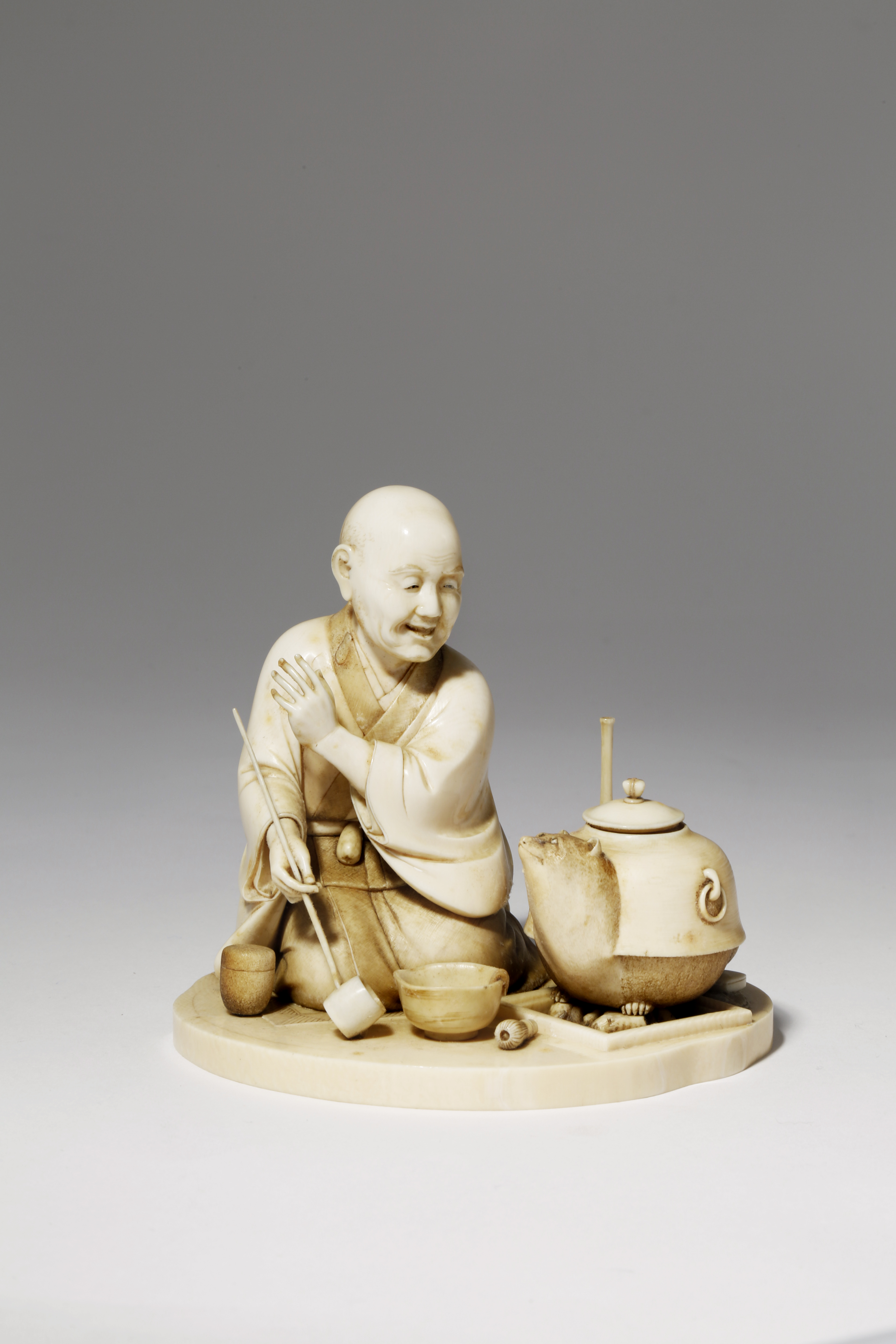 Depicting a kneeling monk surrounded by implements to perform a tea ceremony, smiling as he turns towards a large kettle by his side transforming into a tanuki, the racoon-dog with a benevolent expression, a two character signature for Sosai in a red lacquer tablet underneath, 11.3cm.