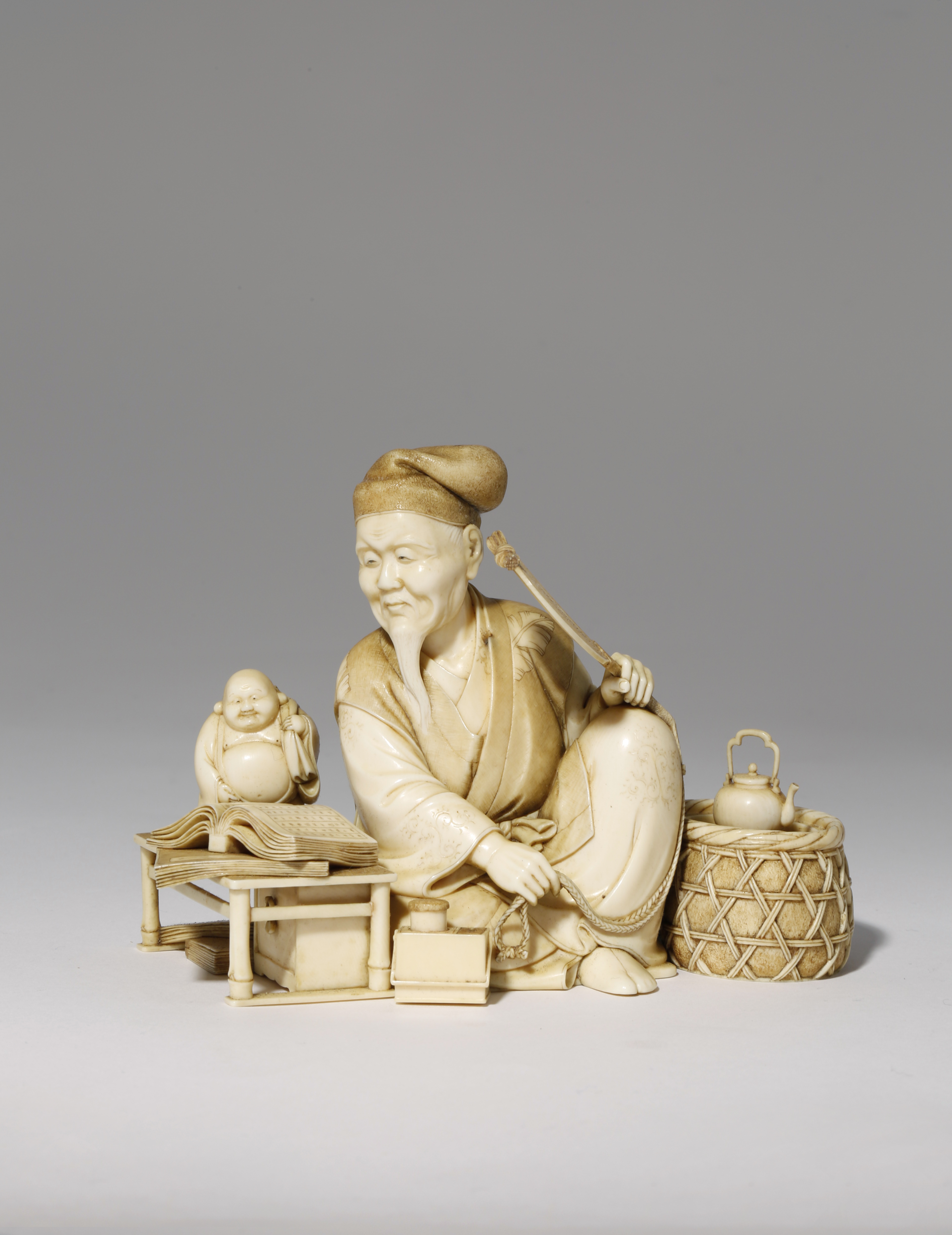 Depicting a scholar at his study, sitting and holding a fan, absorbed in reading a book open on a low table to his right, with further books and a small cabinet underneath, a large carving of Hotei beside him and a kettle in a basket on the other side, the details realistically rendered, a two character signature for Sosai in a red lacquer tablet underneath, 14cm.