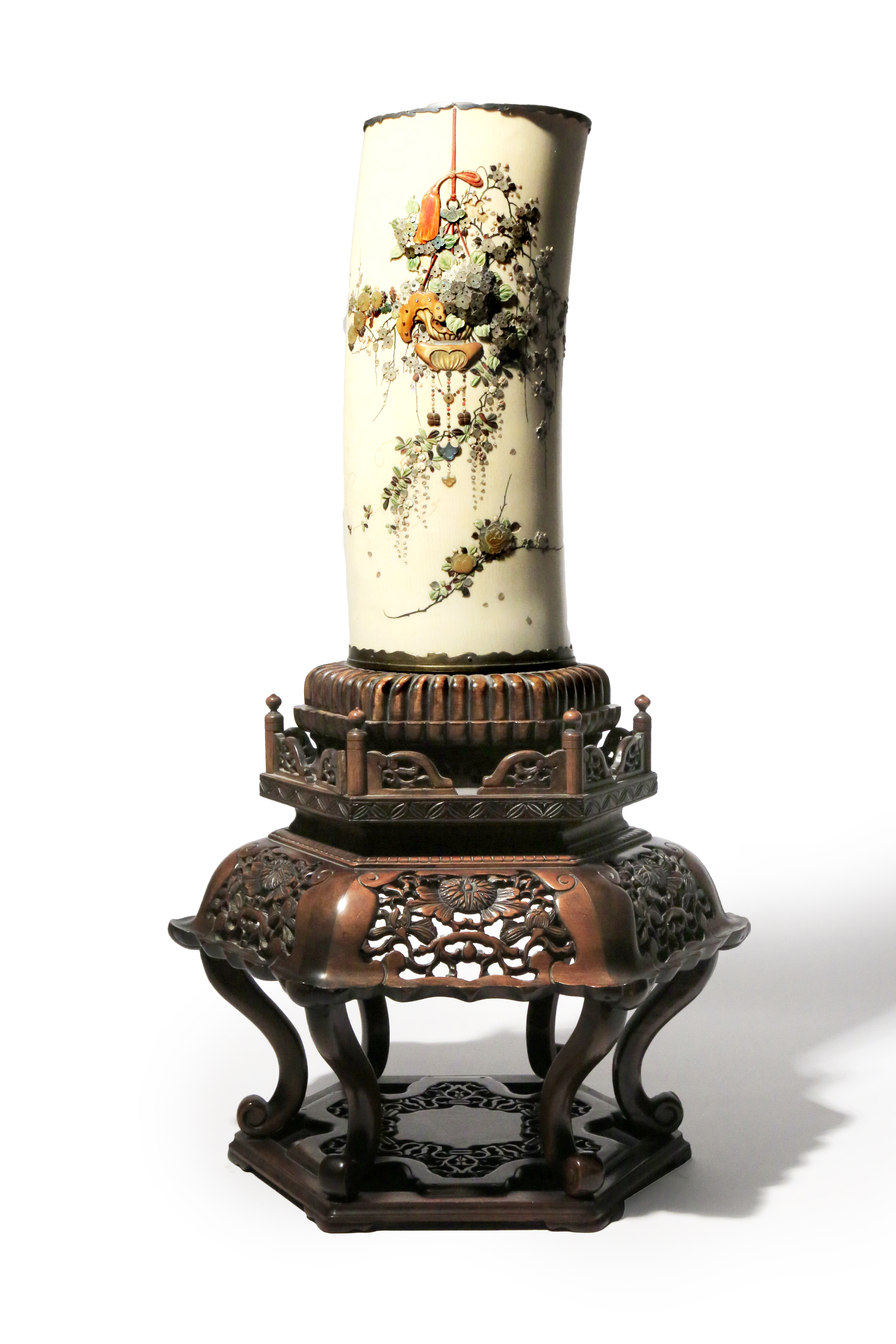With coral, mother of pearl, horn and stained ivory inlays, decorated to one side with a large hanging basket filled with an assortment of chrysanthemum, prunus blossoms, wisteria and peony flowers, with jewels below, the other side with a small lantern-shaped bird feeder on a rootwood table, with branches of chrysanthemum and wisteria flowers around, four small birds surrounding it, a two character rectangular seal mark to the side for Masamitsu, with silver mounts to the rims, all raised on a hexagonal wood stand with tall cabriole legs, the tusk 34cm, 67cm overall. (2)