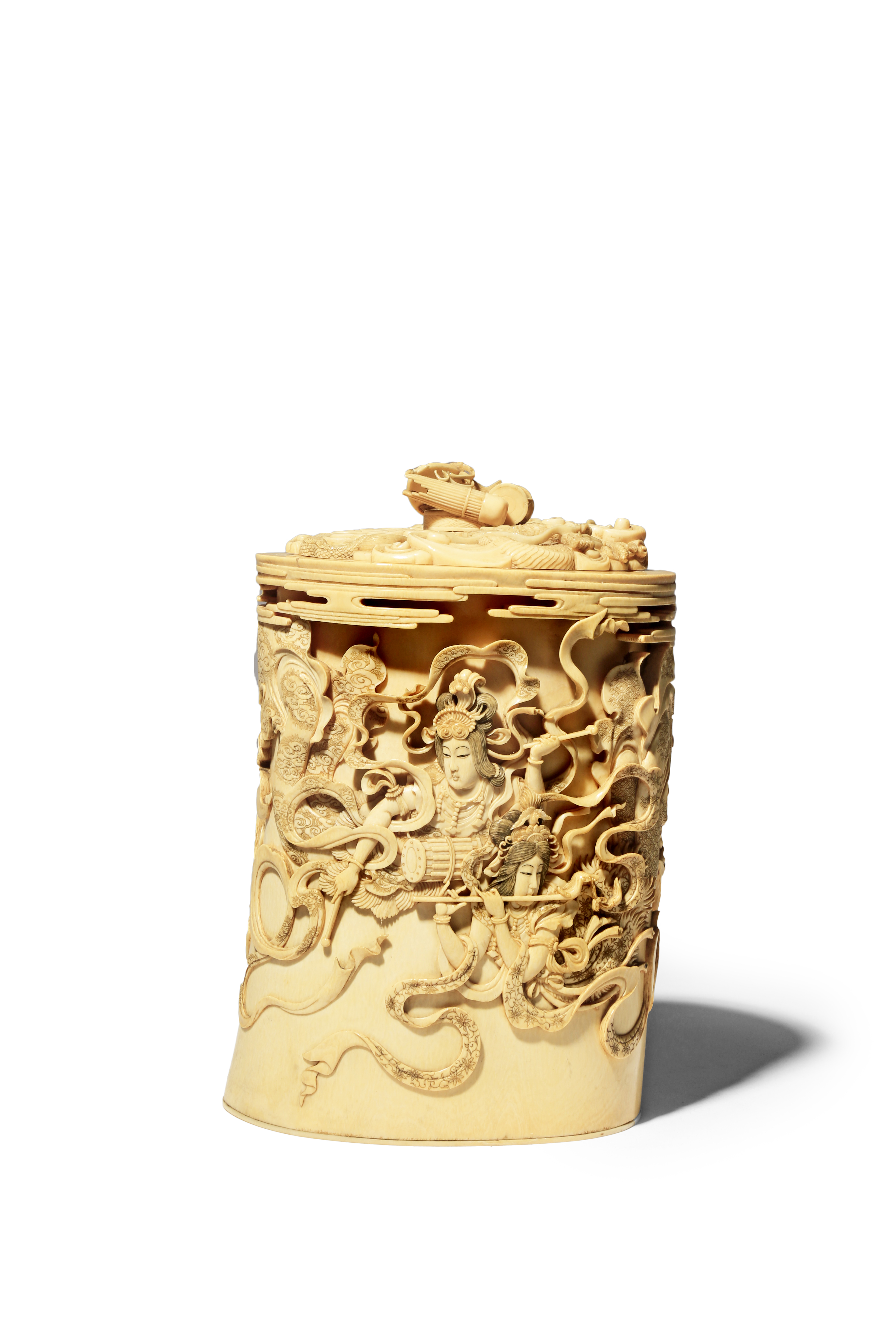 λ A JAPANESE IVORY VASE AND COVER MEIJI 1868-1912 The cylindrical body decorated in high relief...