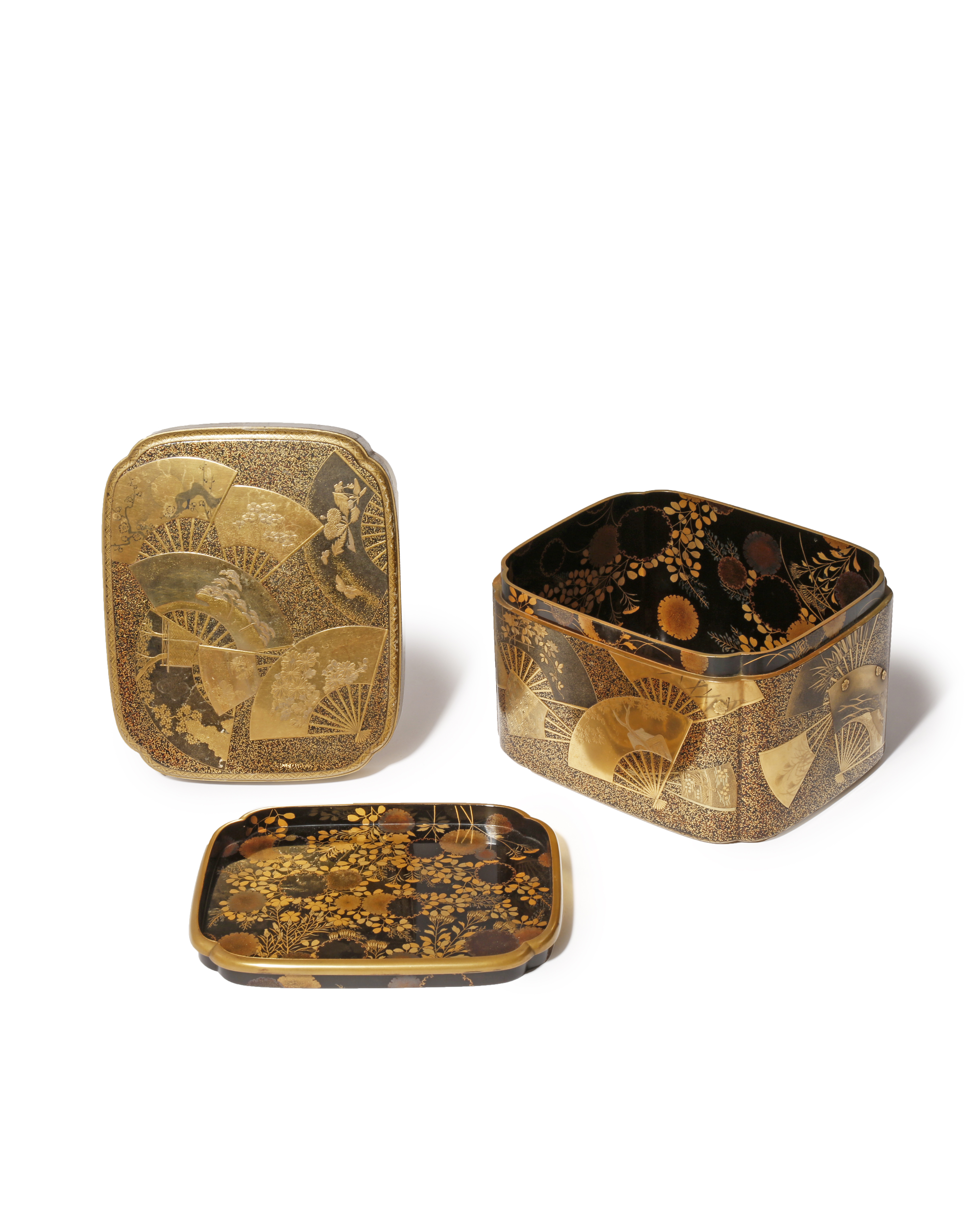 With a rectangular body and lobed corners, the lid and sides decorated with many fans depicted in hiramaki-e, tamaki-e, togidashi and kirikane with a variety of patterns including flowers, butterflies and birds, some imitating ink paintings, the inner tray and inside of the box with the same pattern of dandelion seed heads on a dense ground of foliage; possibly for the storage of sweets, kashibako, 16.2cm x 13.5cm x 11cm. (3)