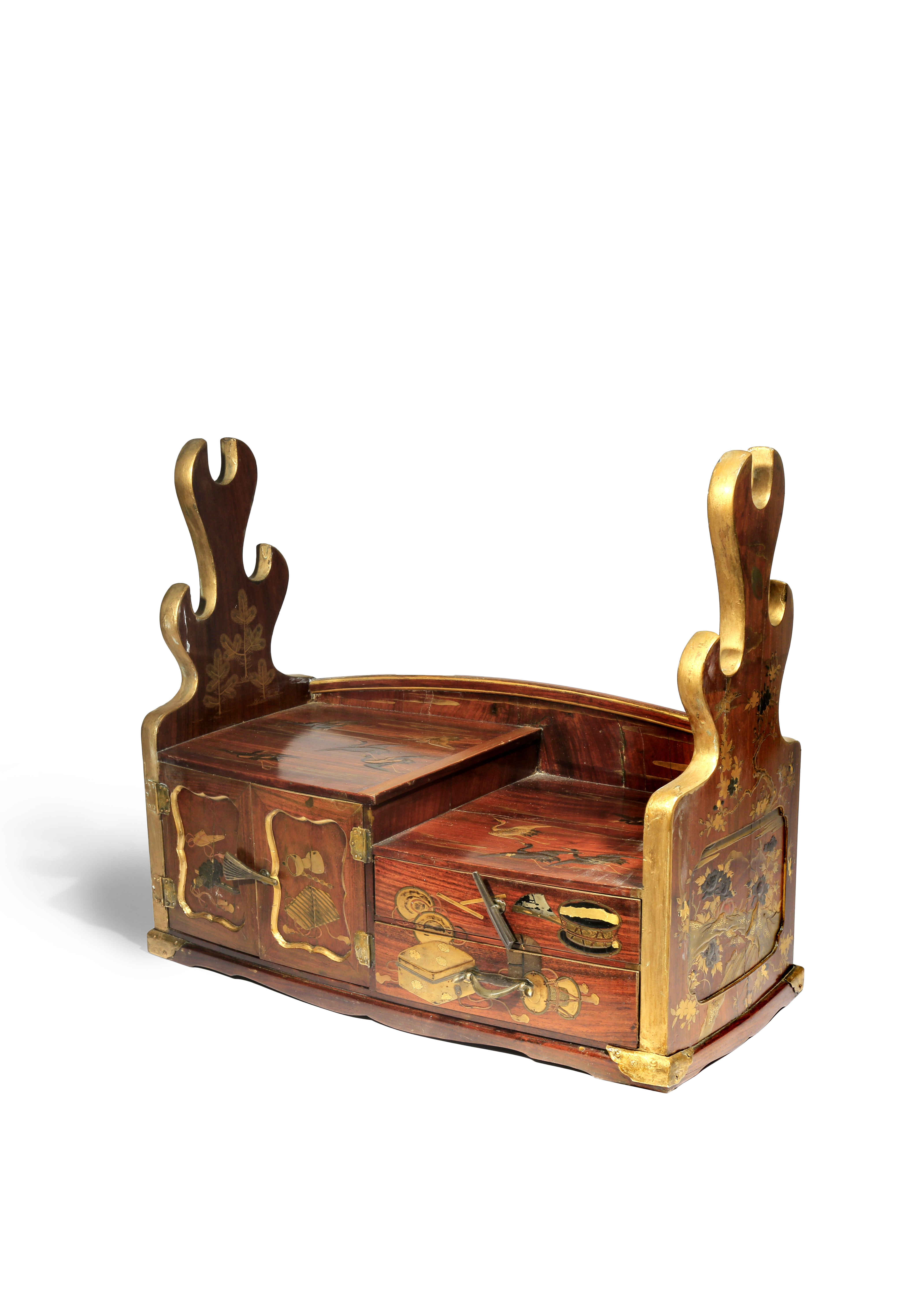 The rectangular body with two tall supports for three swords, the lower section with two drawers to the right and a pair of doors to the left opening on three further drawers, the surface decorated in brown and gold lacquer, takamaki-e, with designs of many cranes in flights, pine needles and musical instruments to the front, the sides with prunus, chrysanthemum and peonies amongst mountainous river landscapes, the reverse with a feather coat in a pine tree before Mount Fuji, 47cm x 40cm x 21cm, (6)