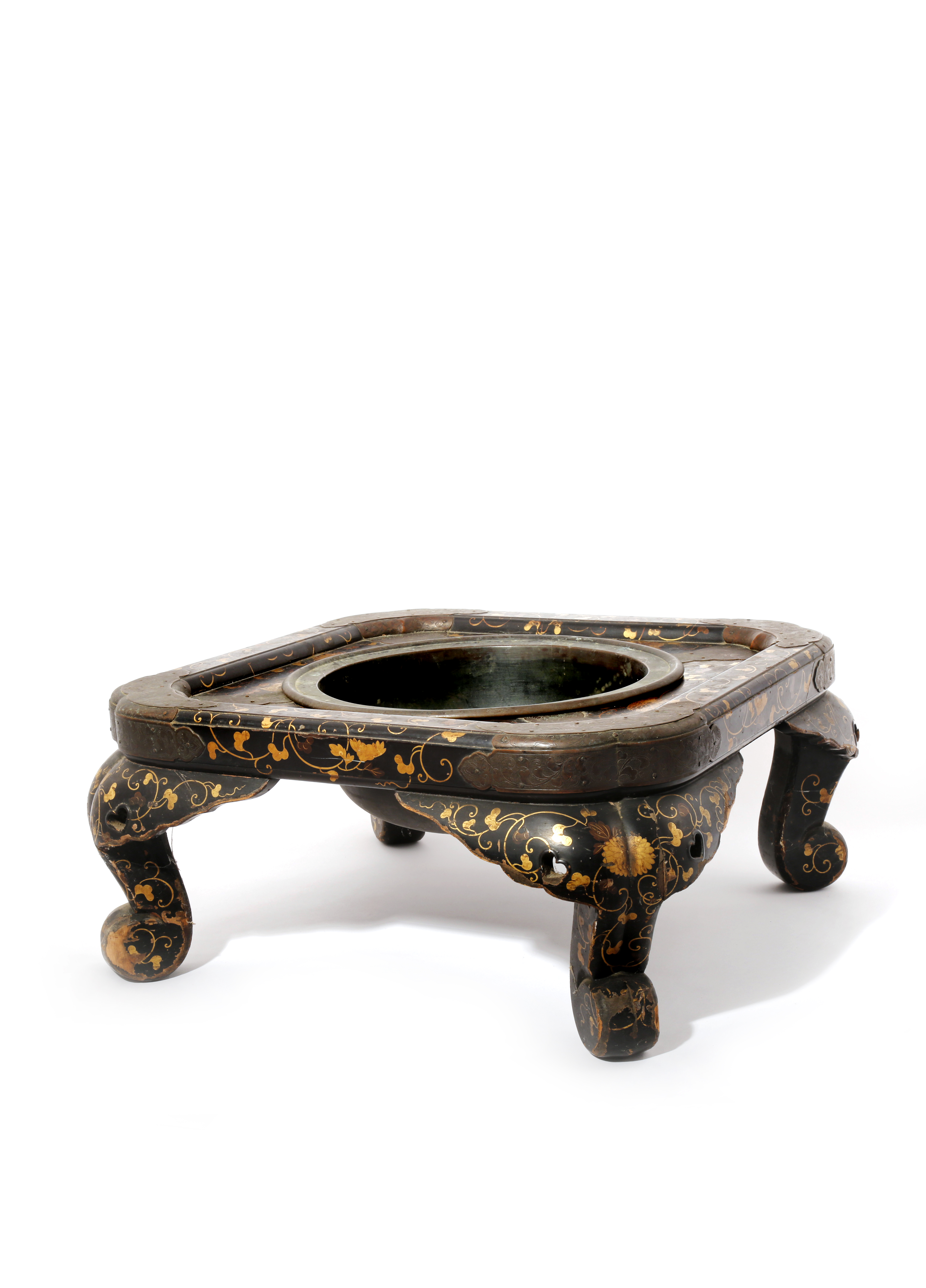 The square body raised on four short cabriole legs, decorated with red and gold chrysanthemum and leafy tendrils, with metal mounts to the corners etched with further patterns of scrolling leaves, the copper liner encased in the centre, 45cm x 45cm x 21.5cm. (2)