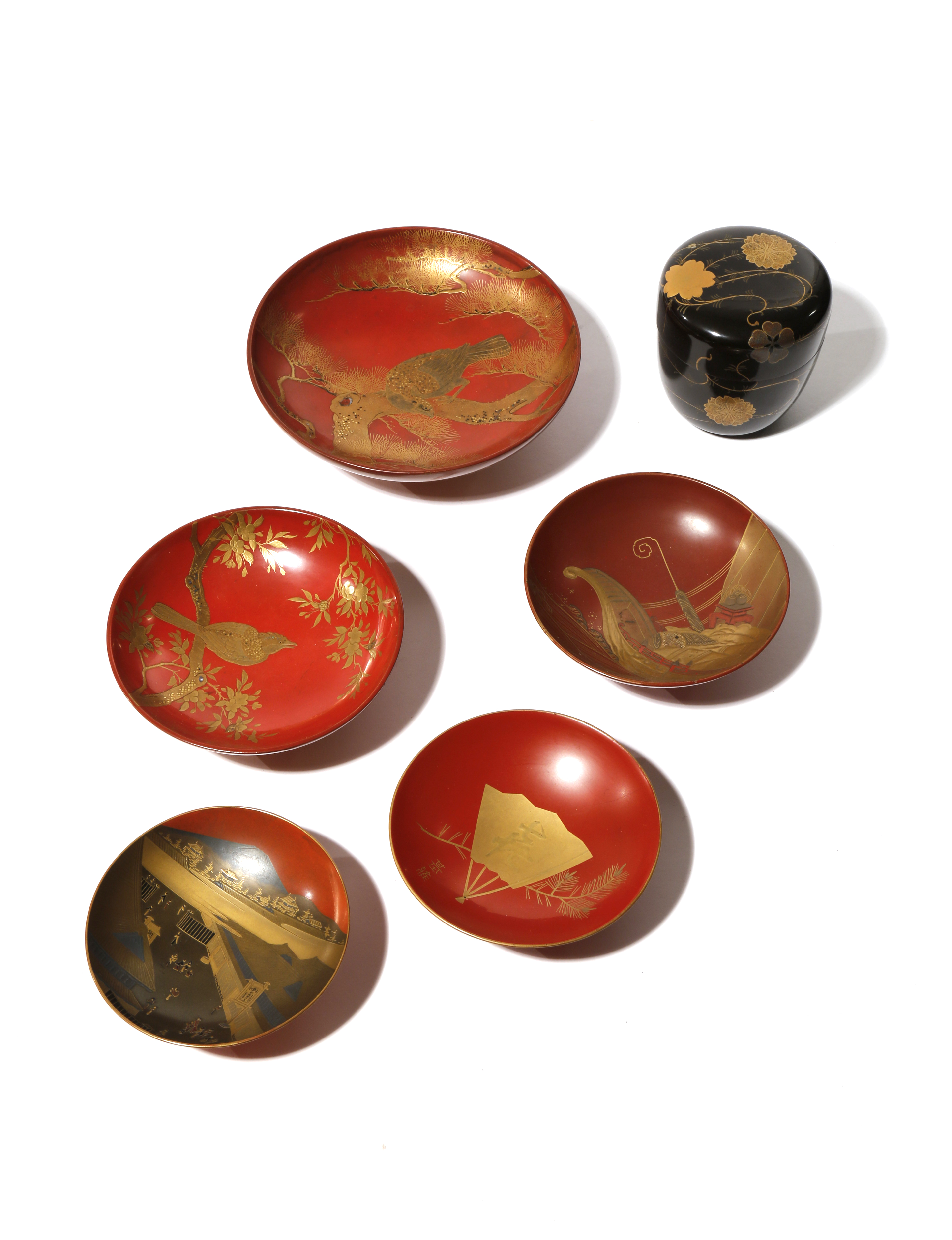 The short rounded body decorated with prunus flowers amongst scrolling tendrils, together with five red lacquer and gold takamaki-e sake cups, sakazuki; two decorated with birds perched on branches; one with the hull of a ship laden with sacred objects, possibly a reference to the Seven Gods of Good Fortune's ship, takarabune; the fourth with a fan inscribed ki and a branch of pine, signed Motomasa to the front and Kizo Tatsumi Kiyomasa to the back; the fifth with a scene of many figures walking down a row of shops, with Mount Fuji in the background, signed Byakkisai, 13.1cm max. (5)