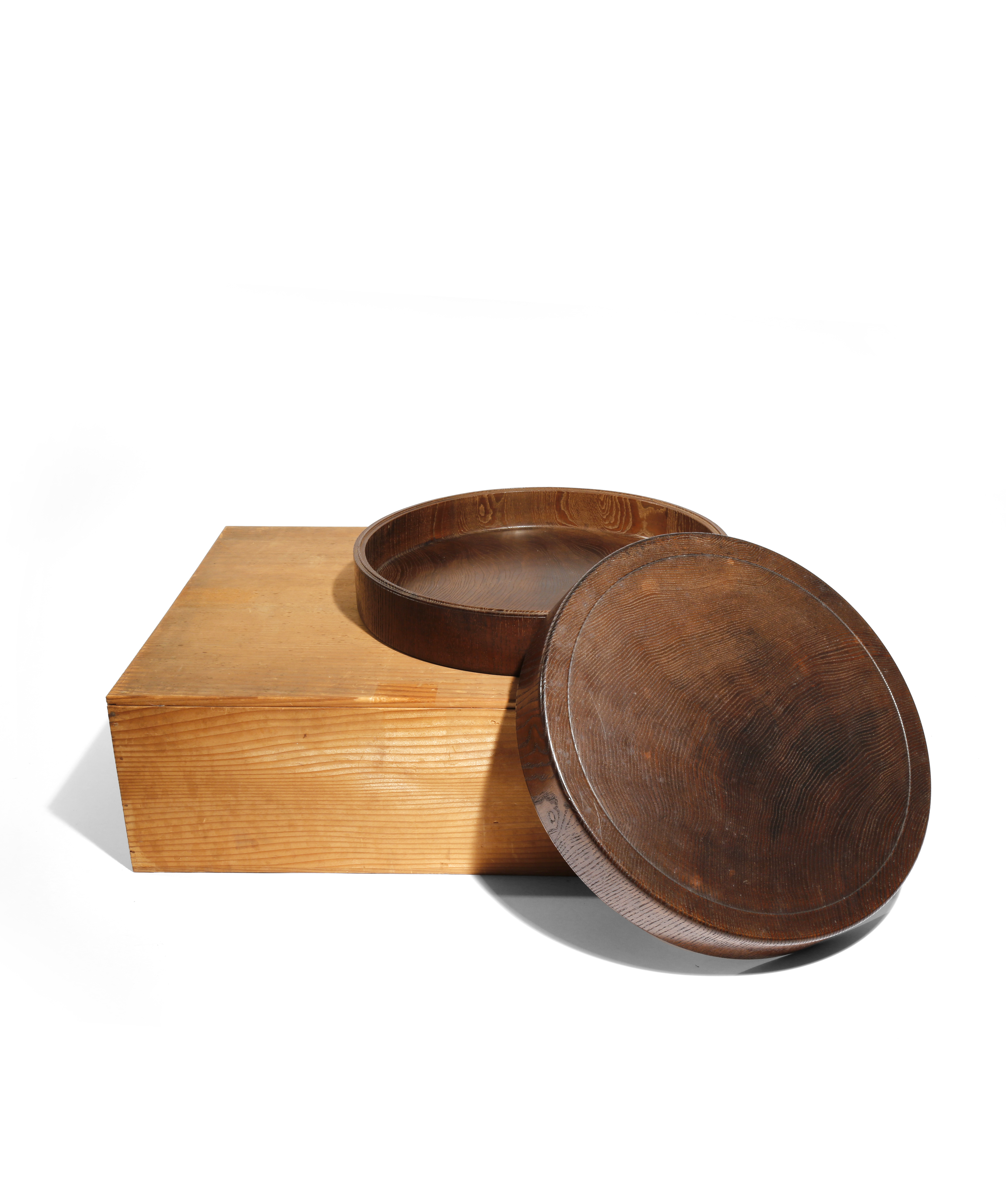 The circular body in keyaki (Japanese zelkova), the undecorated surface emphasizing the natural wave-like wood grain, together with a fitted tomobako box, 34cm dia. (4)