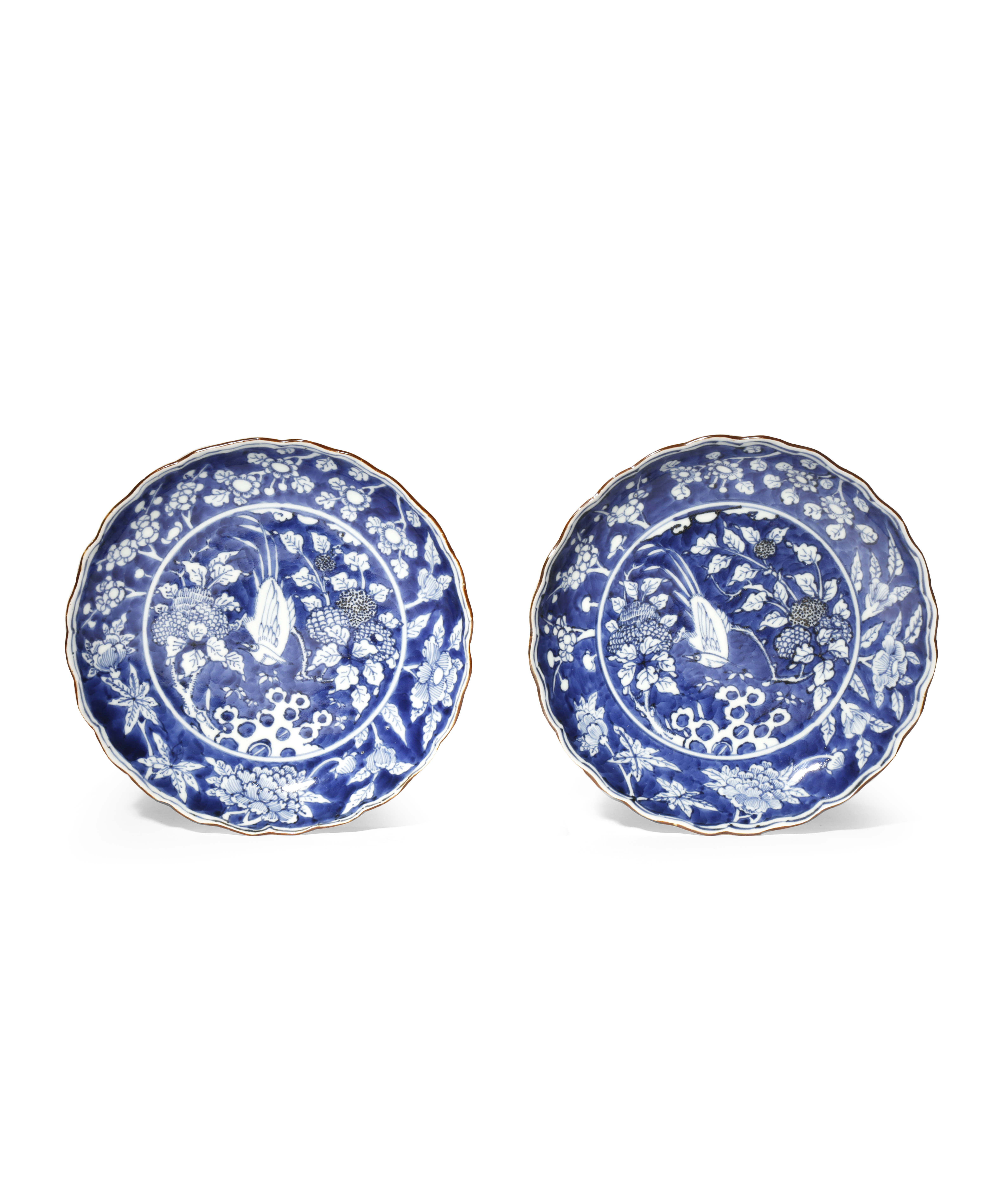 Both with scalloped edges and decorated with a central panel enclosing a small bird perched on a flowering branch of chrysanthemum, with rockwork beneath it, the cavetto with a continuous band of peonies, prunus and other flowers, both raised on a short foot, the base with later inscriptions in black ink, 21.7cm. (2)