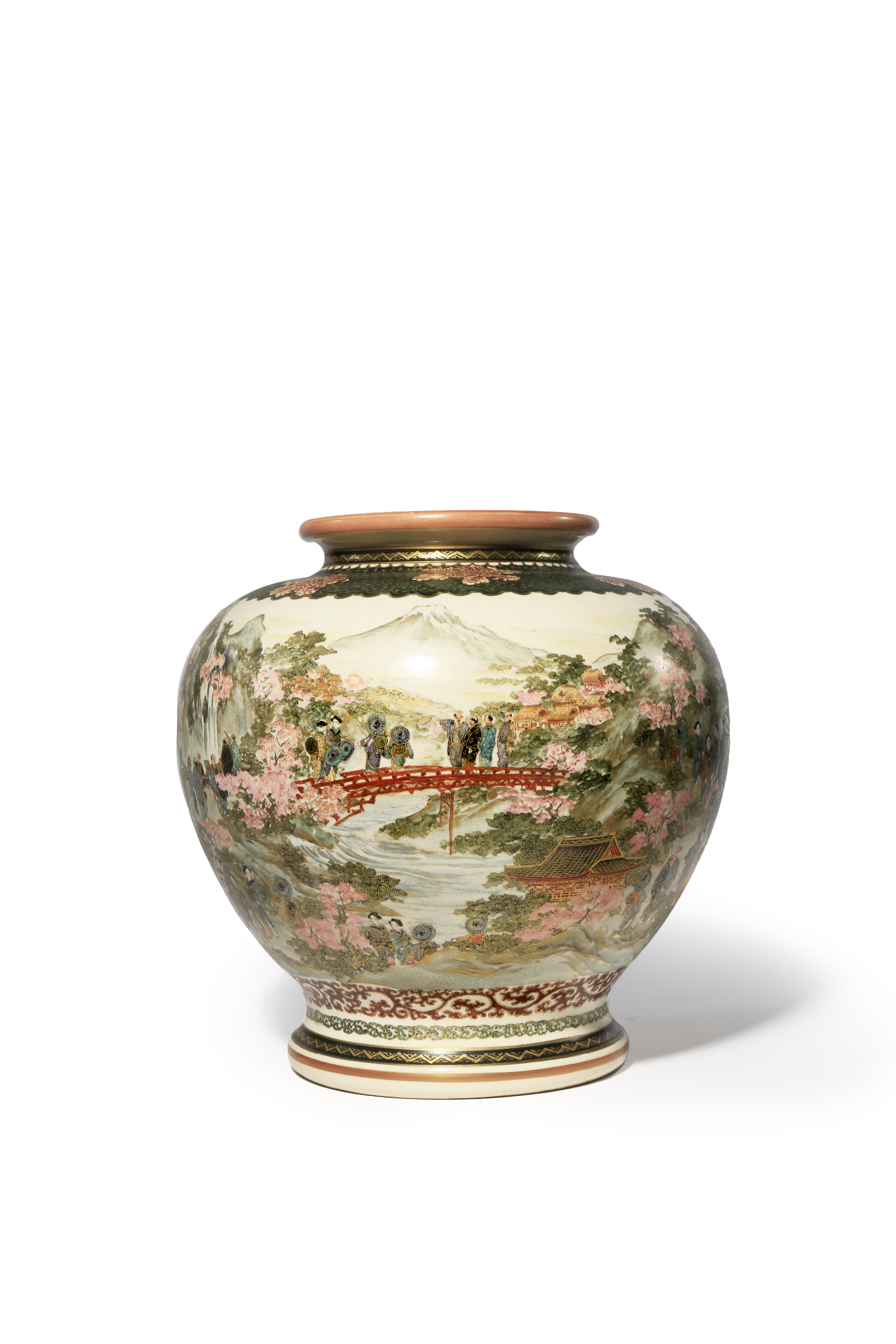 The bulbous body decorated with a continuous scene of many figures in a mountainous river landscape, with thatched buildings, a four -storey pagoda and a shrine amongst the luxuriant vegetation, a red wood bridge crossing a stream to one side with Mount Fuji in the background, the details painted with an abundance of gilt and many trees with pink foliage, the shoulder with a band of stylised flowerheads and scrolling tendrils on a dark green ground, the foot with further bands of scrolling patterns and geometrical designs, the base with a three character signature for Zenkozan in gilt on a black rectangular reserve, with the Shimazu mon above, 22.5cm.