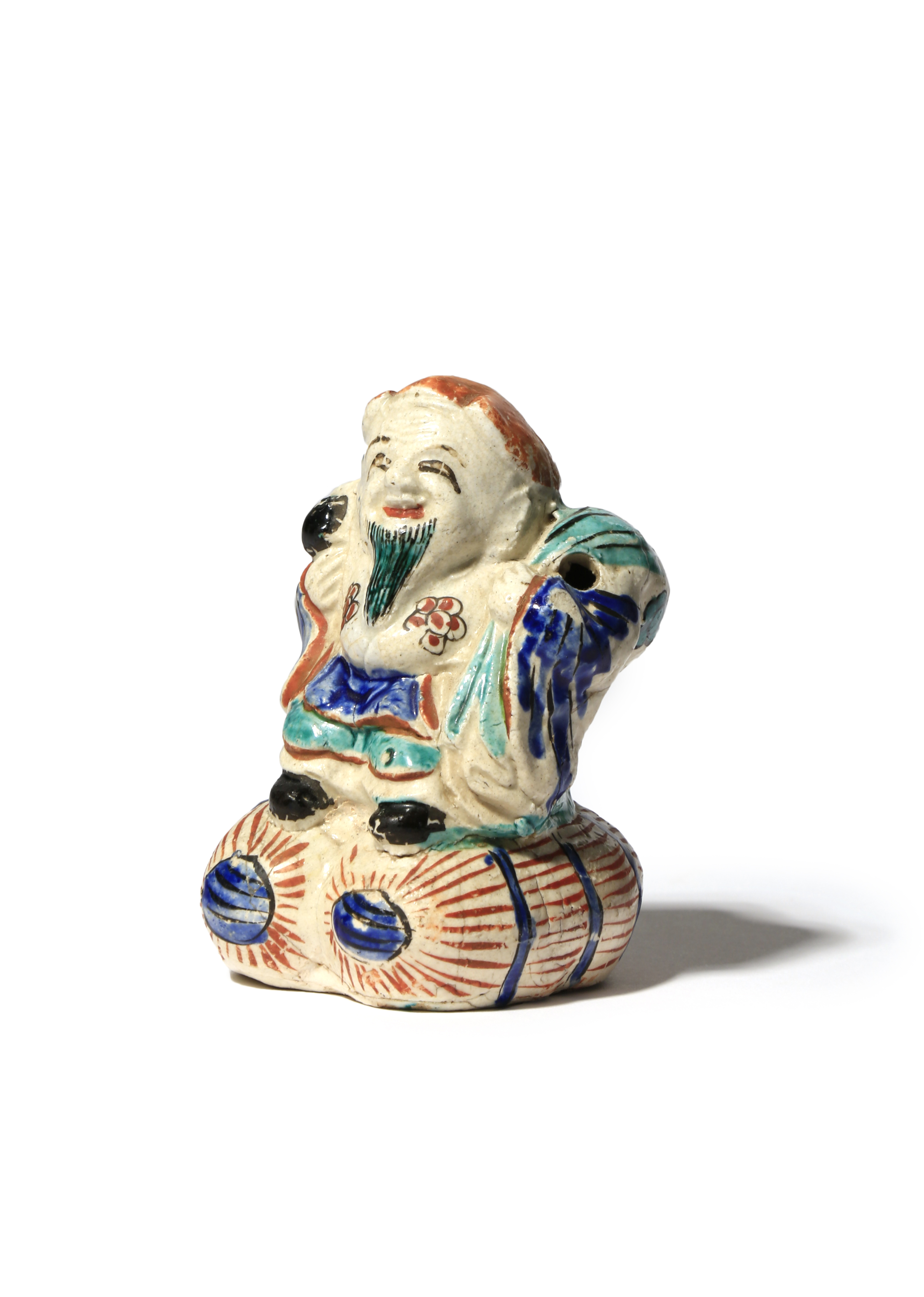 A KAKIEMON FIGURE OF DAIKOKU C.1700 The God of Good Fortune depicted standing on two large rice...