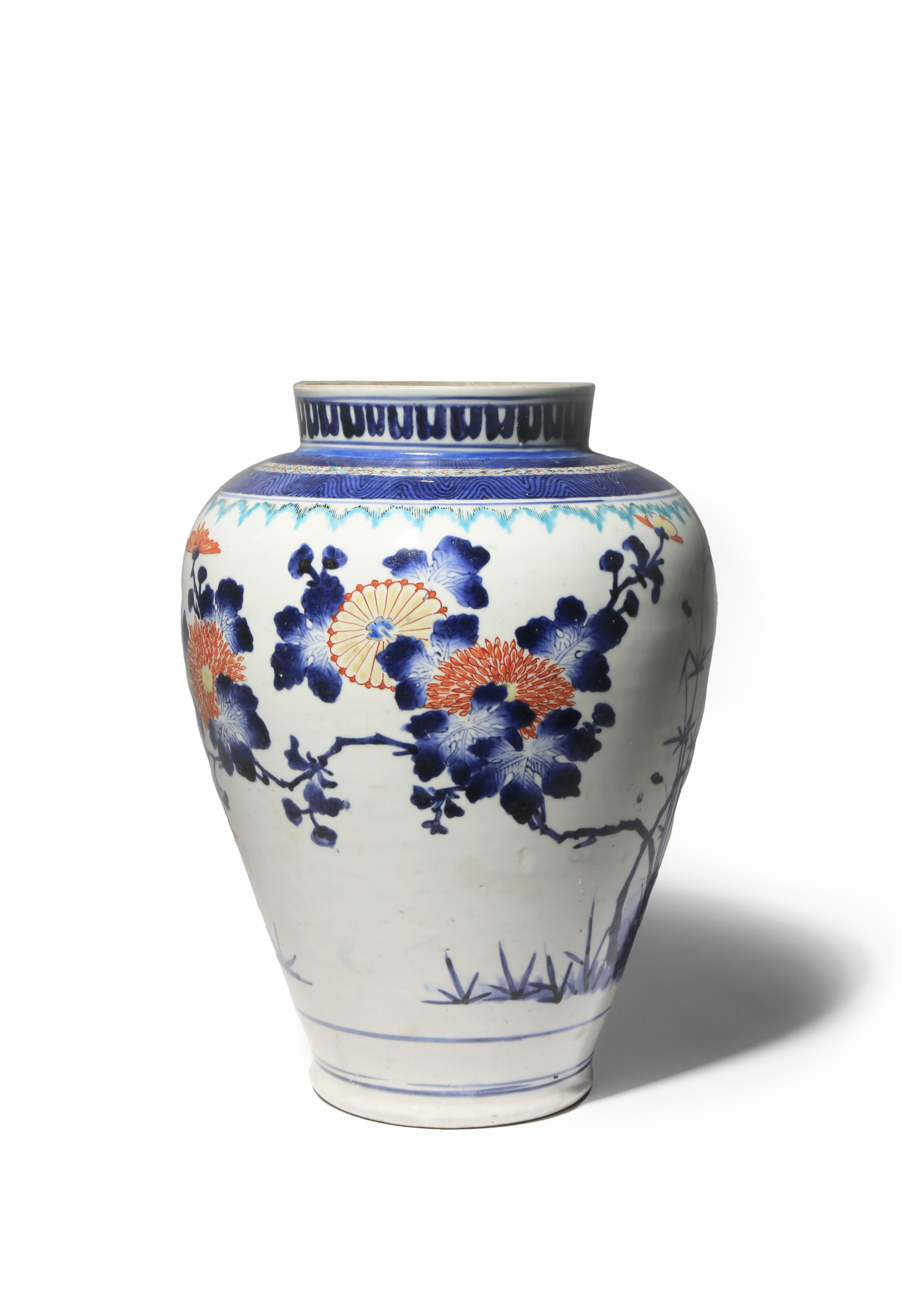 The ovoid body decorated in underglaze blue and iron-red, yellow and cyan with a continuous design of large sprays of chrysanthemum and grasses, the shoulder with bands of chevrons and cash patterns, the neck with lappets, with two concentric lines above the foot, 29.5cm.
