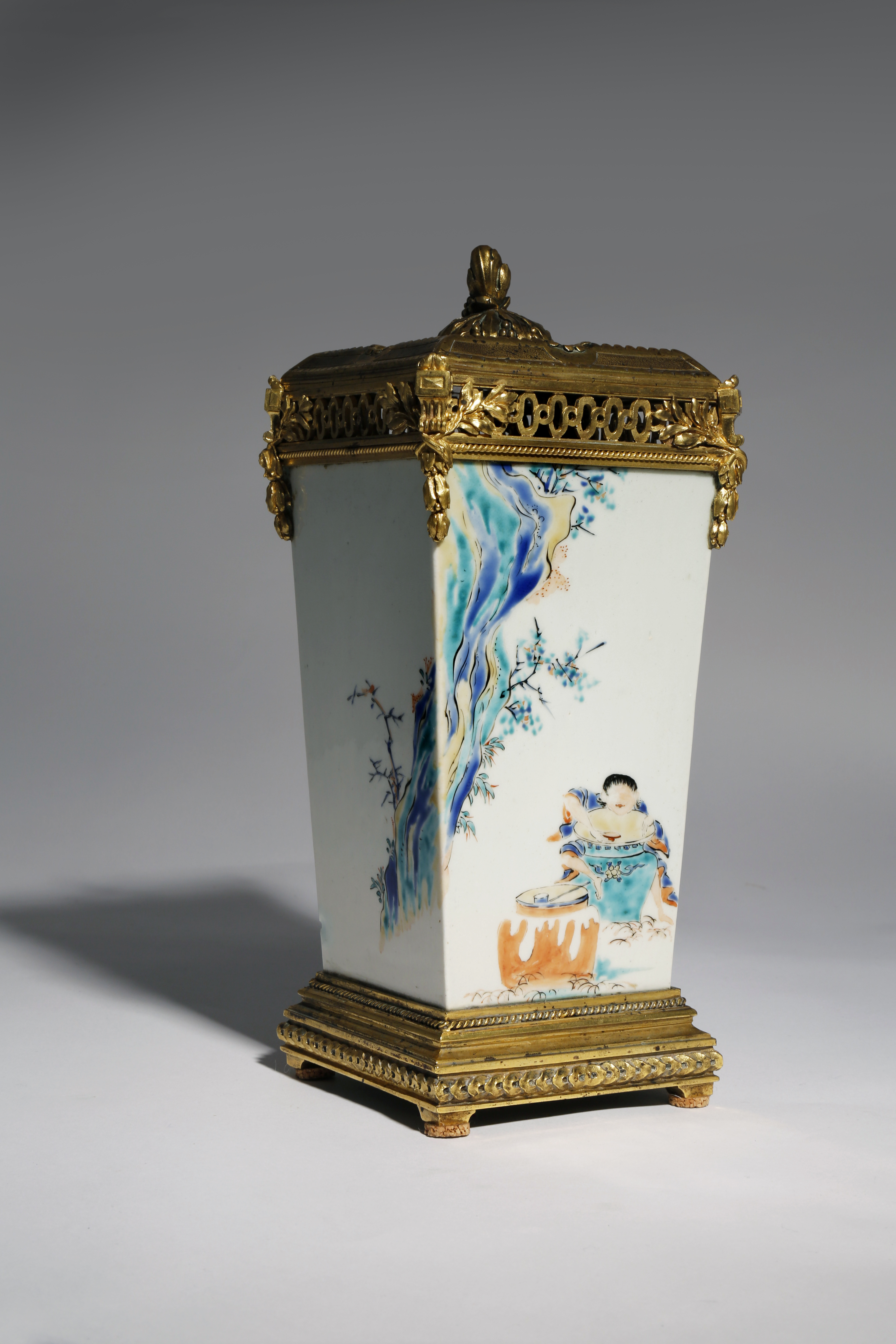 Originally a sake bottle, tokkuri, decorated in cobalt, yellow, black, cyan and orange enamels, with a continuous design of a figure hugging a large jar, holding a small sake cup in his right hand and merrily drinking the contents, with another jar in front of him, possibly a variation on the subject of Hob in the well (before the fall), with flowering branches growing from craggy rocks to the side and reverse, the lid with prunus flowers and four apertures, the vase richly decorated with ormolu mounts with leafy garlands and topped with further leaves and grapes, the ormolu base inscribed Escaliers de Cristal Paris, 26cm. (2)