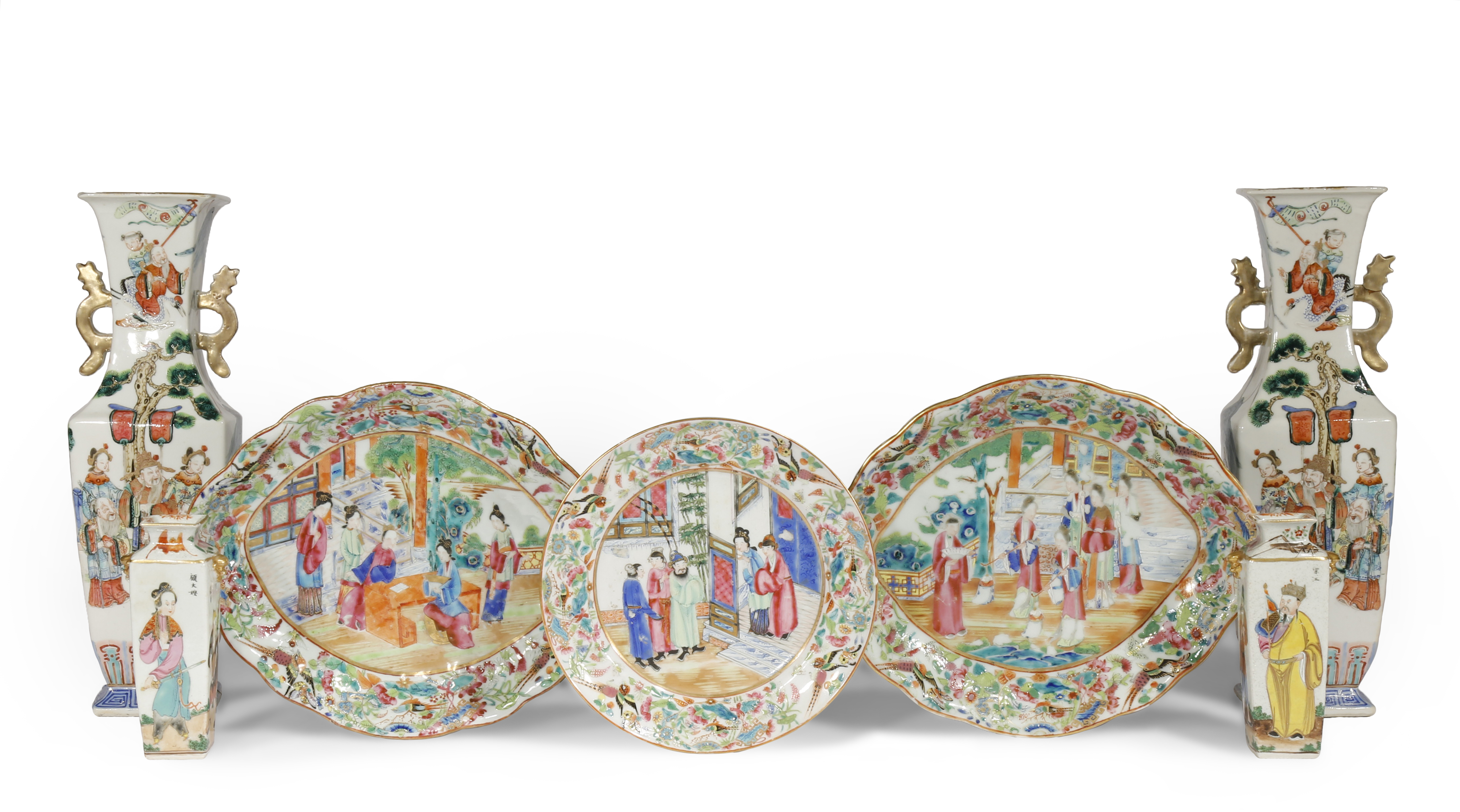 FOUR CHINESE CANTON FAMILLE ROSE VASES AND THREE DISHES 19TH CENTURY Comprising: a pair of large...
