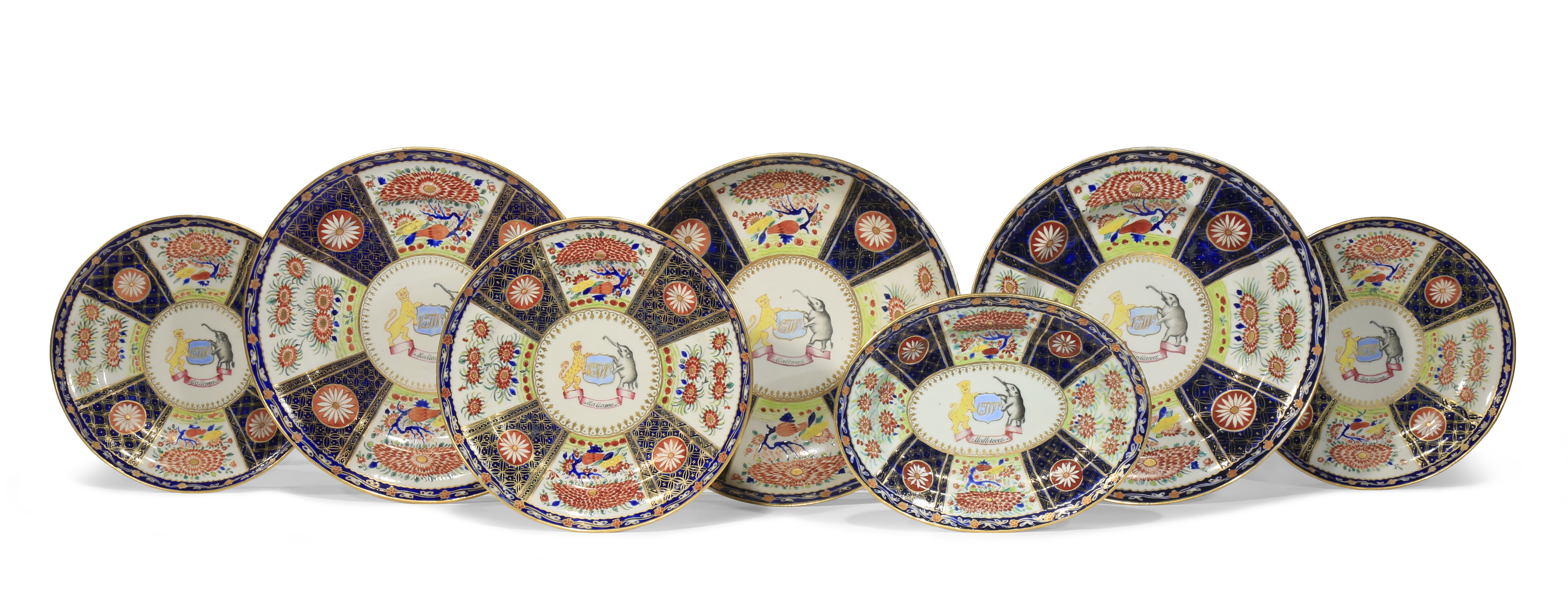 Comprising: six circular dishes and one oval dish, the centre of each with an armorial of an elephant and wild cat framing the monogram 'C J W' above a banner inscribed 'Mallacca', all encircled by alternating panels of flowers and formal flowerheads on diaper brightly painted in enamels and gilt, 24.9cm. (7)