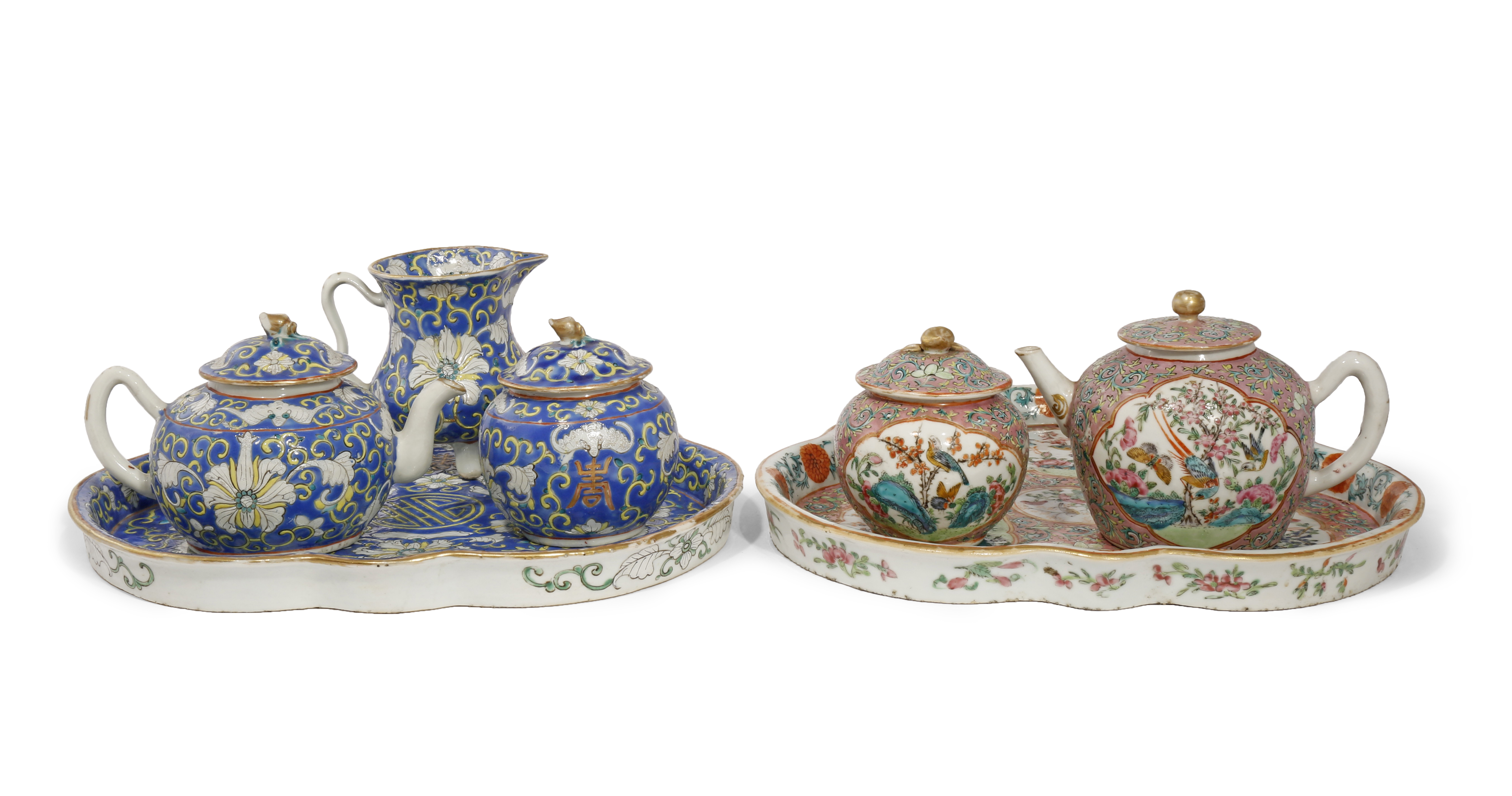 Comprising: two teapots and covers, two sugar bowls and covers, two trays, and one cream jug, one set painted with scrolling lotus, shou characters and bats against a blue ground, the other with cartouches enclosing birds and butterflies amongst flowers on a floral-decorated pink ground, 27cm. (11)