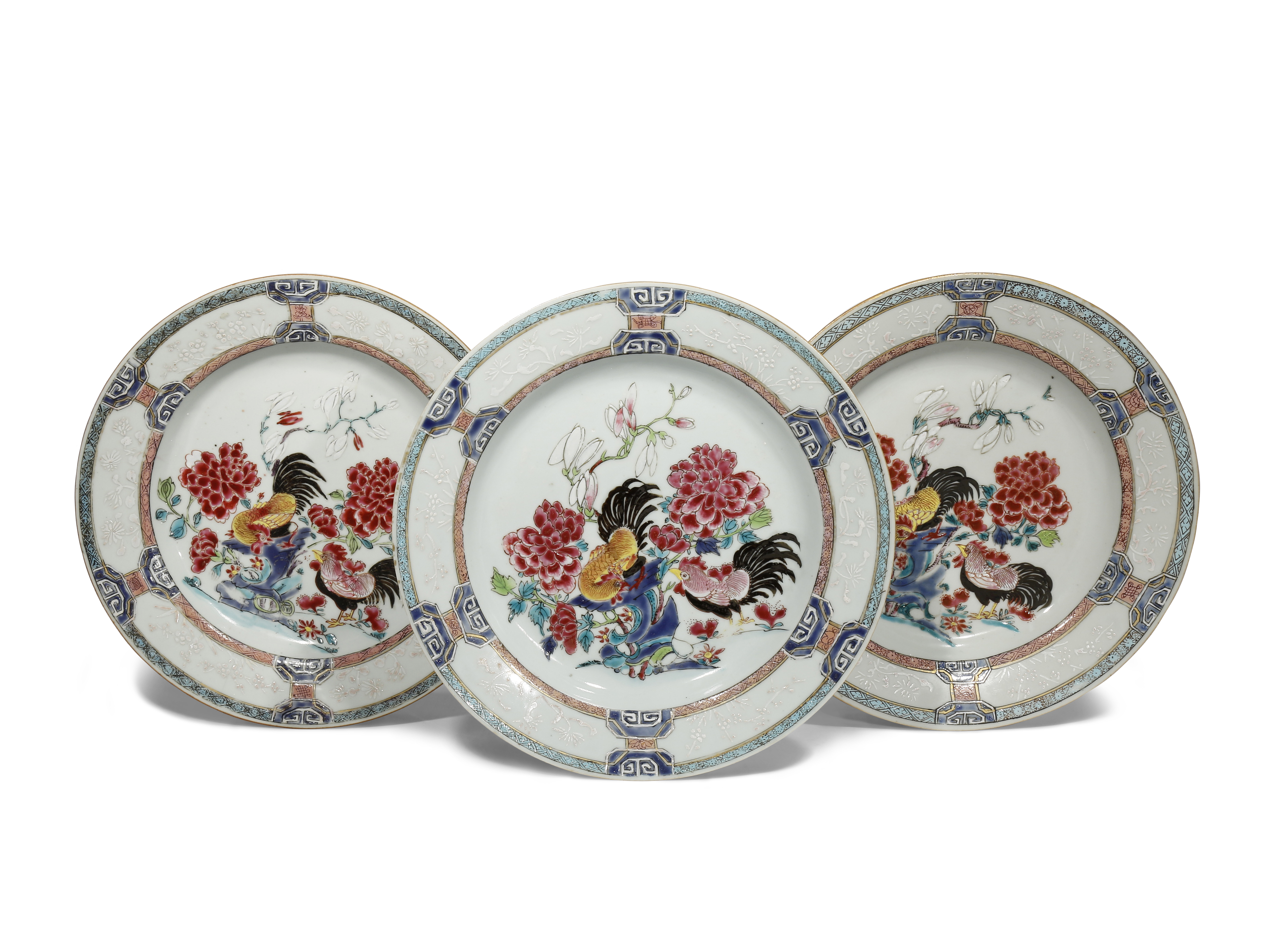Each painted to the centre with two cockerels amongst rockwork, peony and magnolia, the rims decorated with six bianco sopra bianco panels containing sprays of chrysanthemum and prunus, all surrounded by turquoise and pink bands of geometric designs, 23cm. (3)