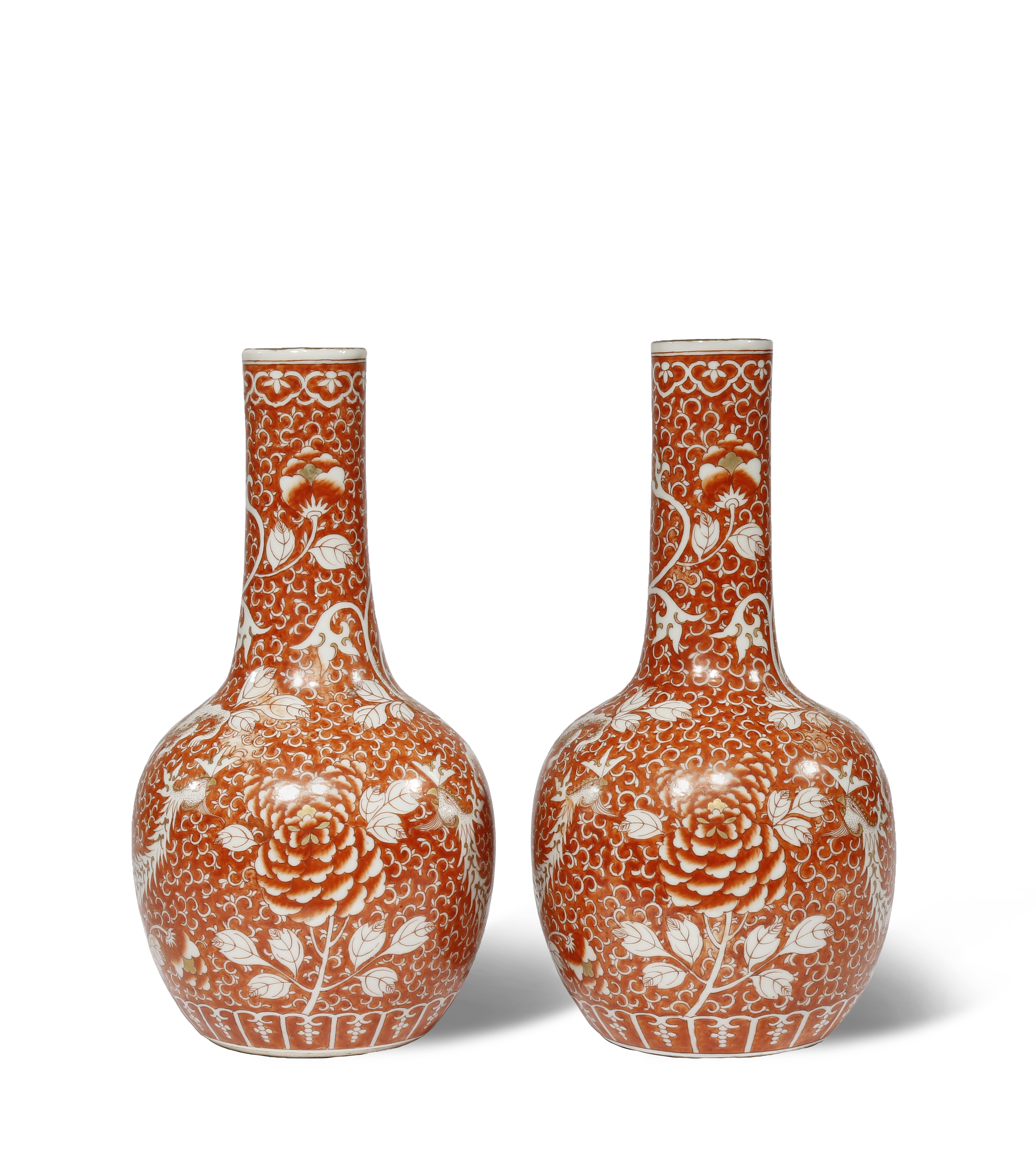 A PAIR OF CHINESE IRON RED-GROUND 'PHOENIX' BOTTLE VASES 19TH CENTURY The body of each decorated...