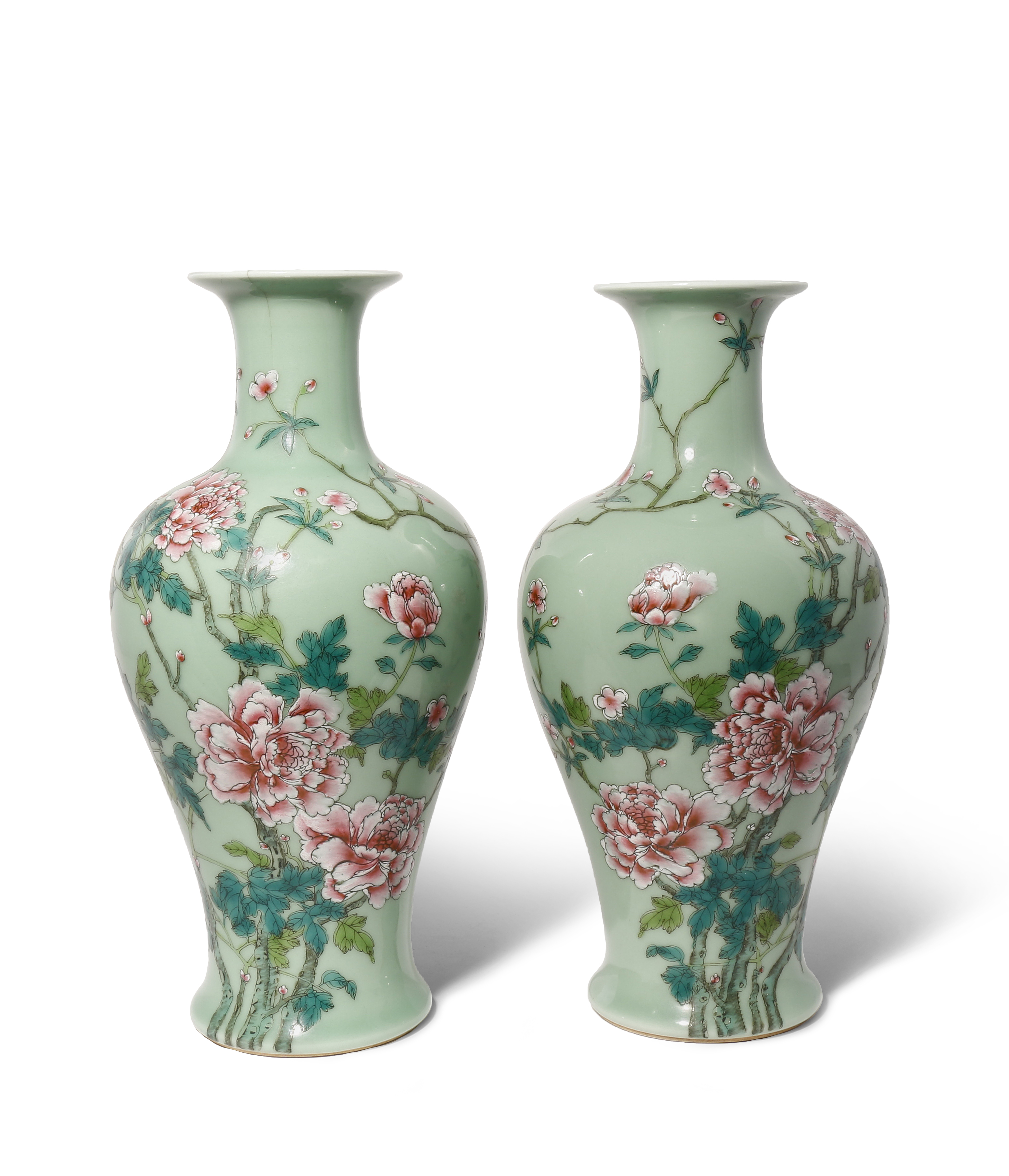 A PAIR OF CHINESE FAMILLE ROSE CELADON-GROUND VASES