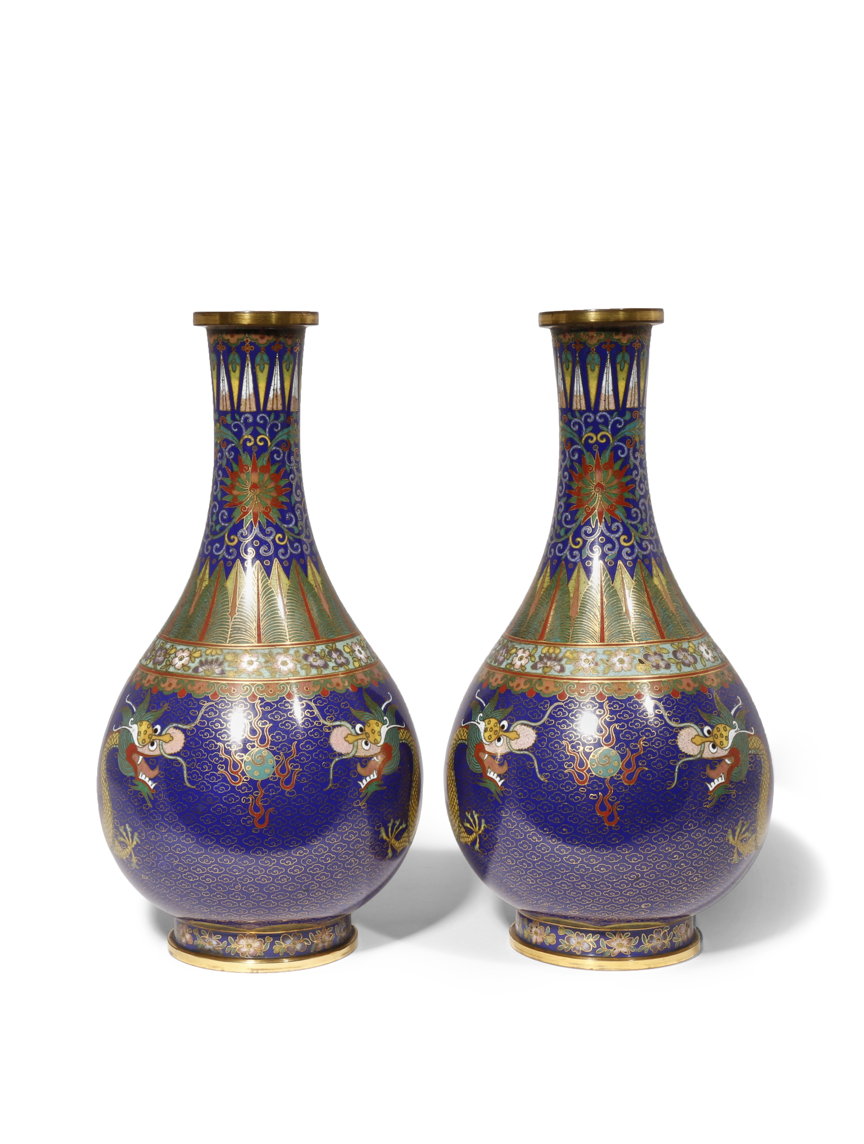 A PAIR OF CHINESE CLOISONNE BOTTLE VASES SIGNED LAO TIAN LI EARLY 20TH CENTURY The body of each...