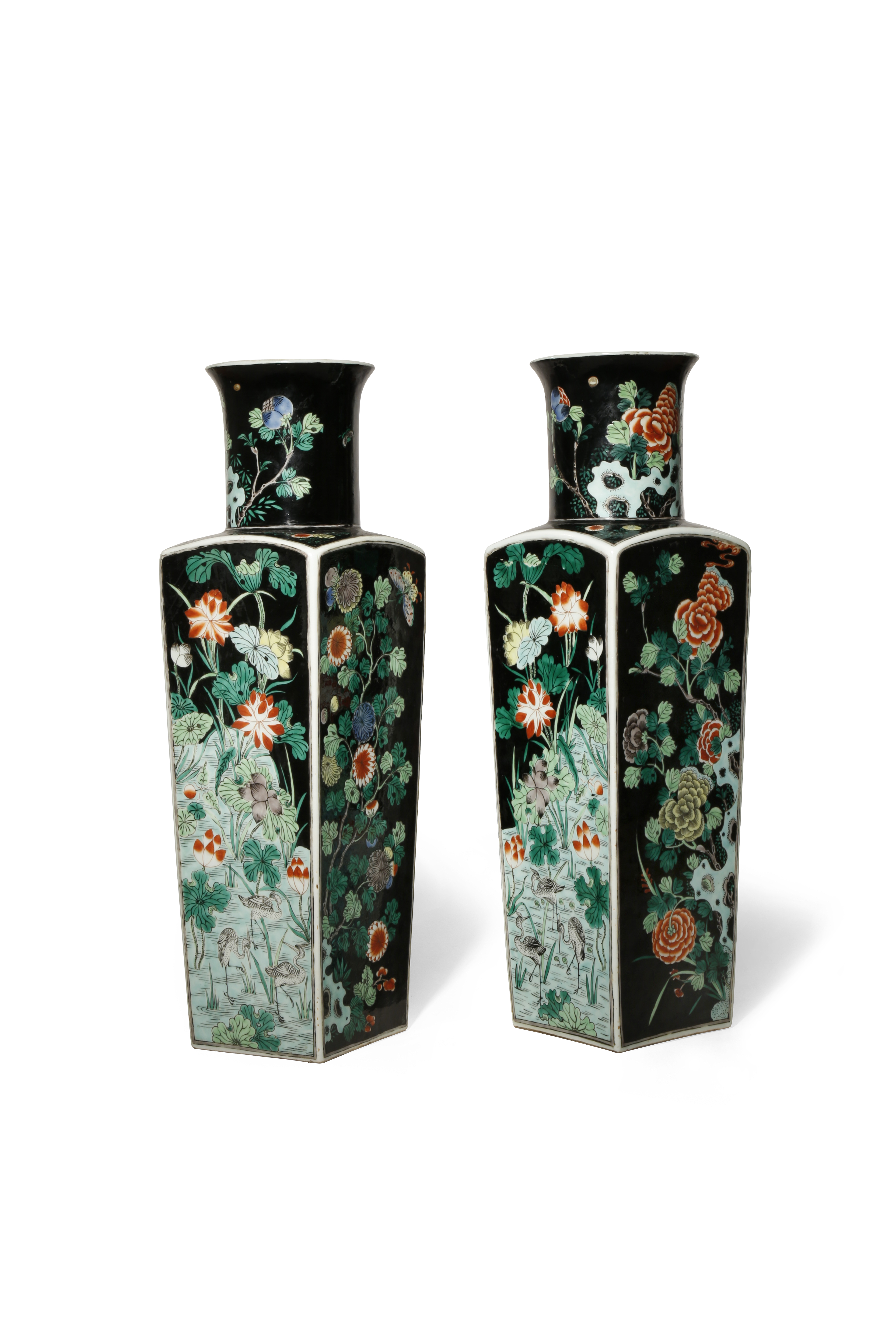 A PAIR OF CHINESE FAMILLE NOIRE 'FOUR SEASONS' VASES LATE 19TH CENTURY The square-section...