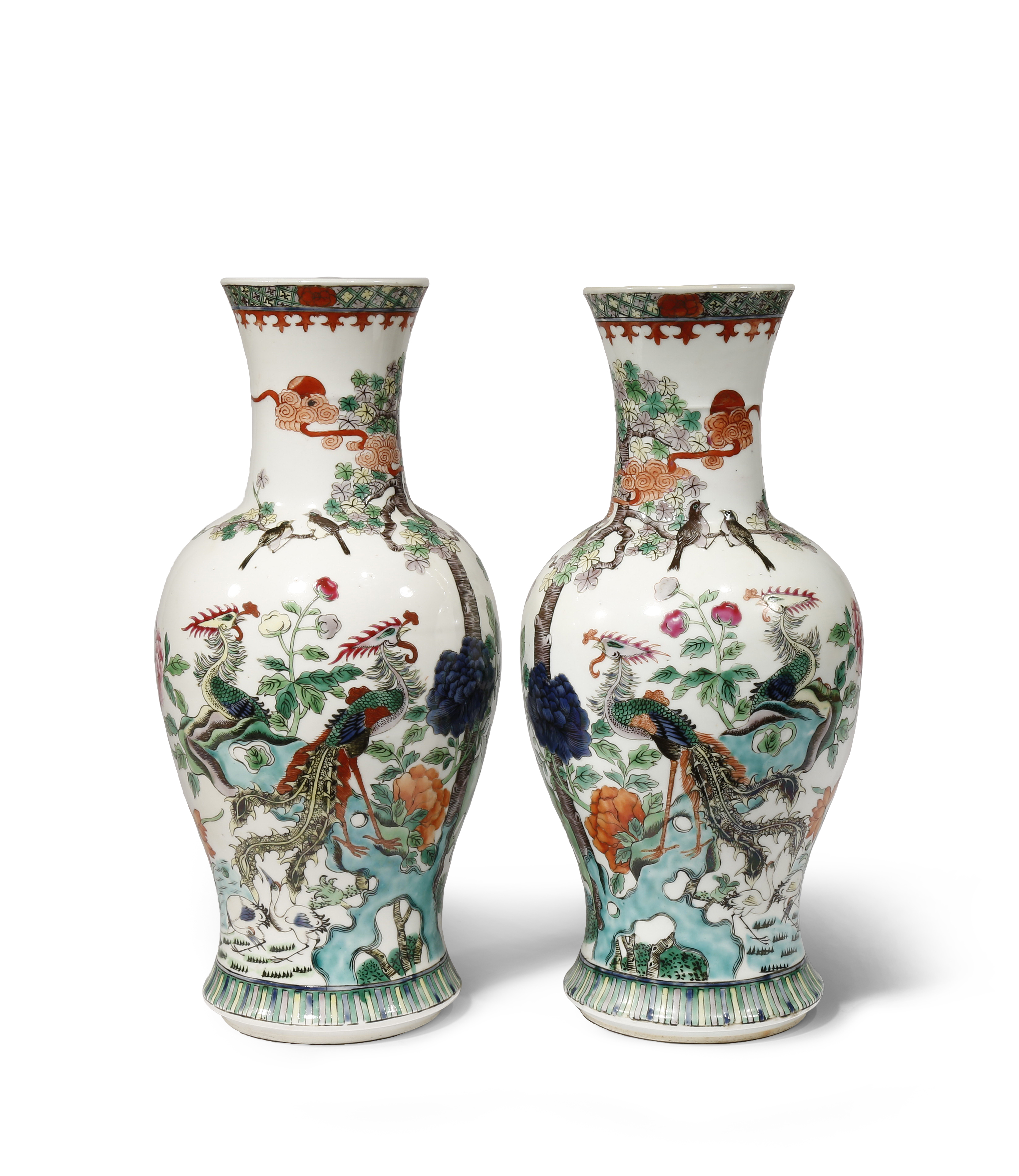 A PAIR OF CHINESE ROSE-VERTE 'BIRDS' VASES 19TH CENTURY Each painted with a pair of phoenix...