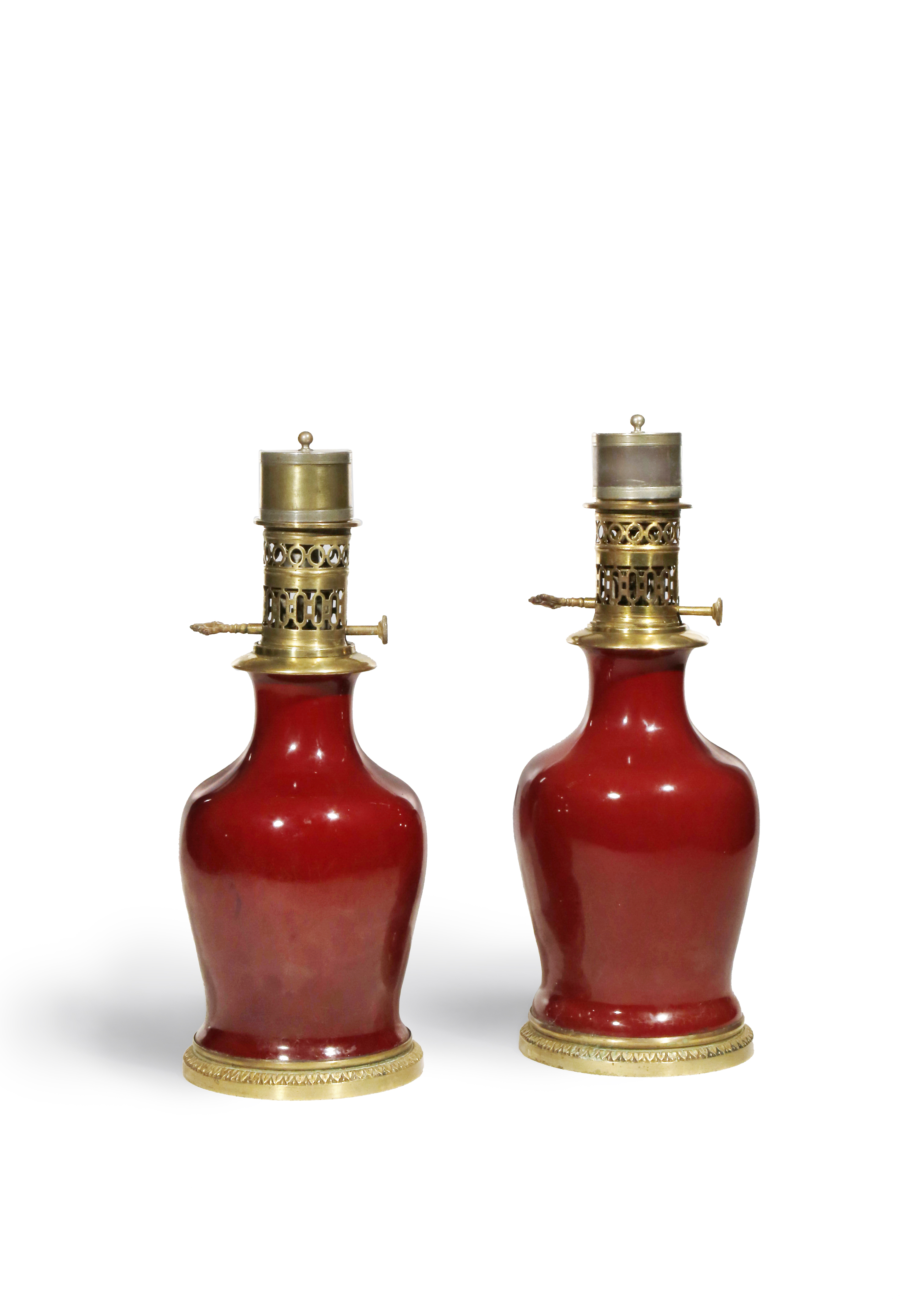 With ovoid bodies and flaring necks, mounted as lamps, decorated with an even sang de boeuf glaze, 39cm. (4)