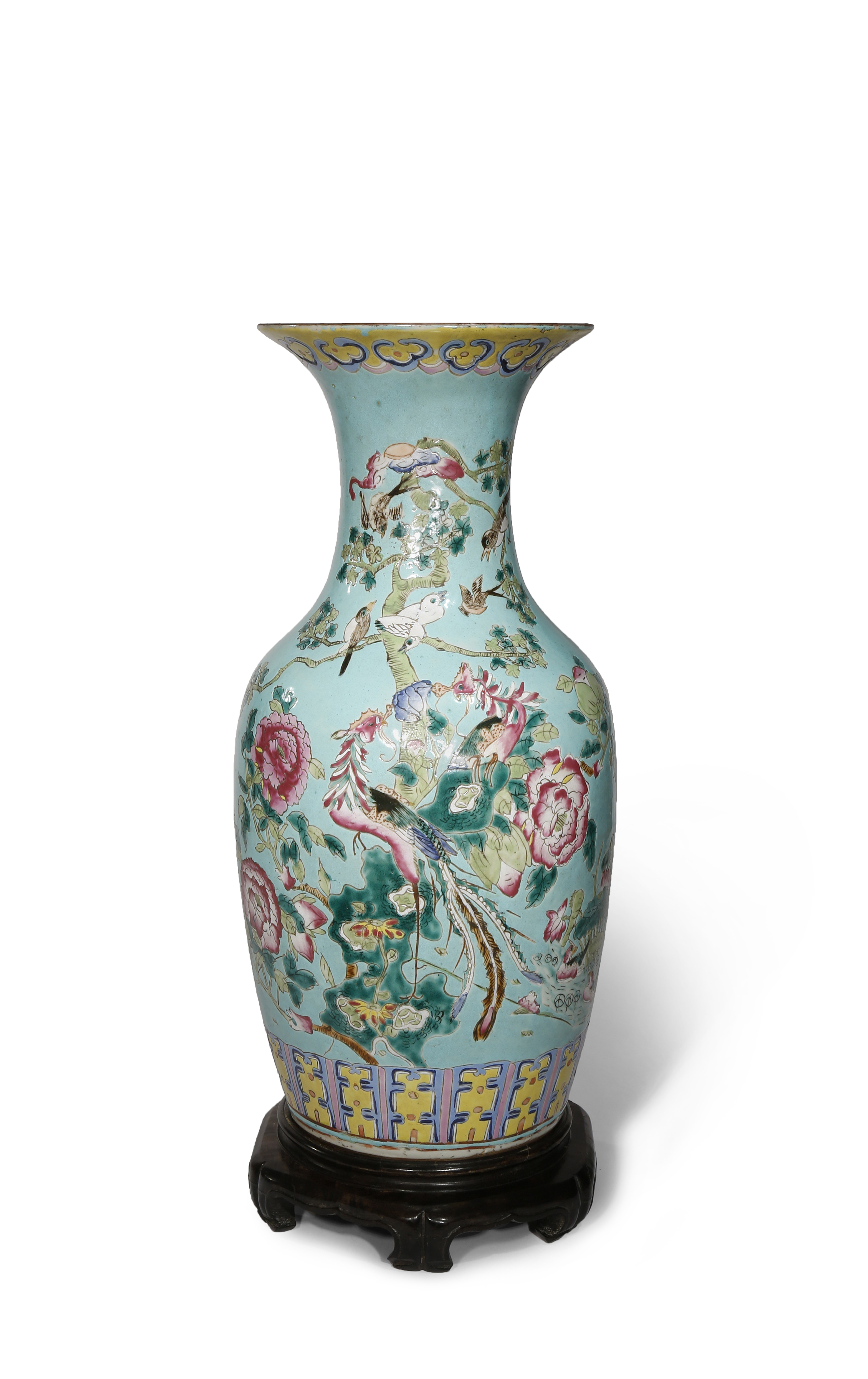 A CHINESE FAMILLE ROSE TURQUOISE-GROUND VASE 19TH CENTURY The ovoid body rising to a flared neck