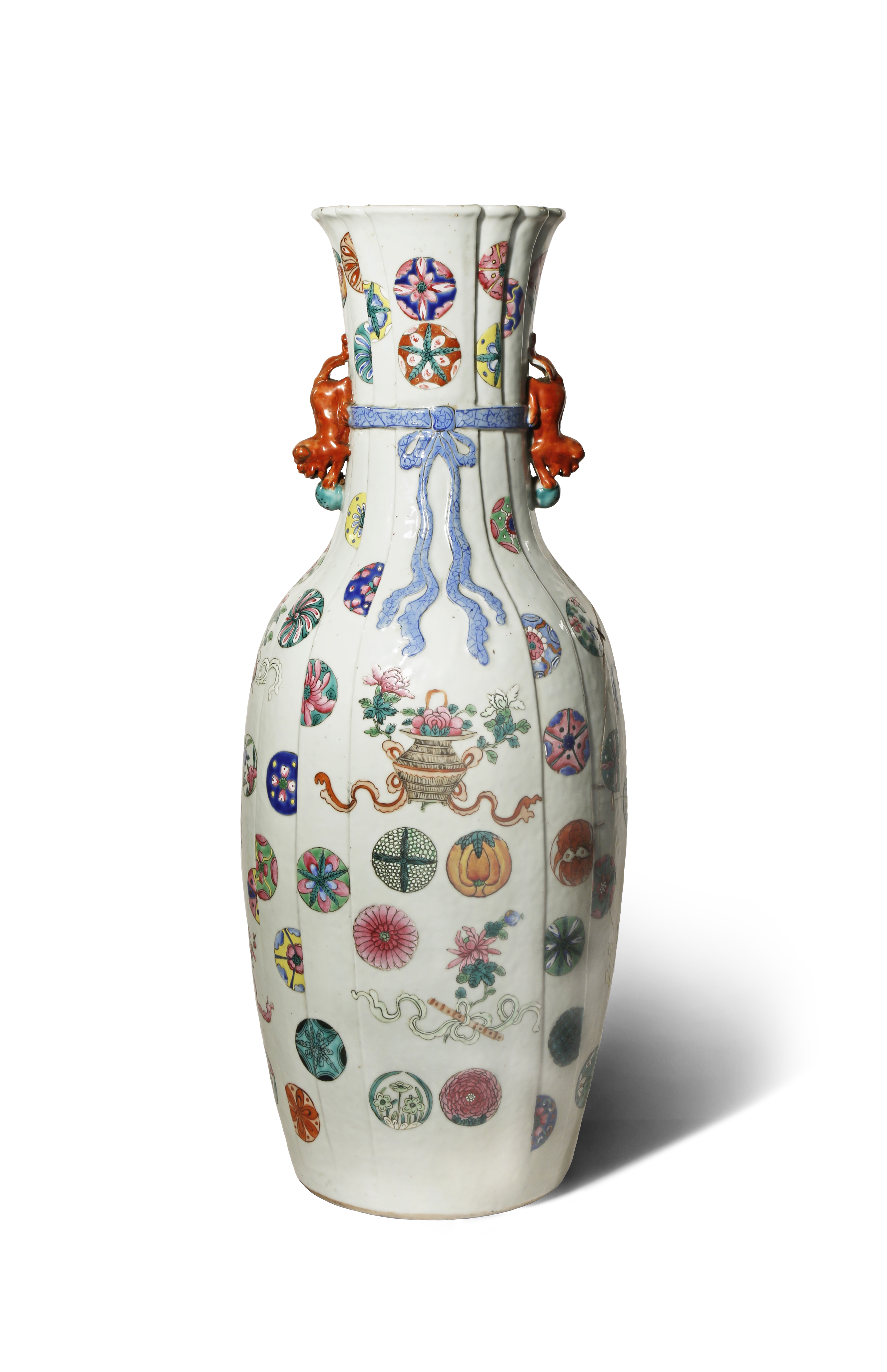 A LARGE CHINESE CANTON FAMILLE ROSE VASE MID 19TH CENTURY Moulded as pleated fabric tied with a...