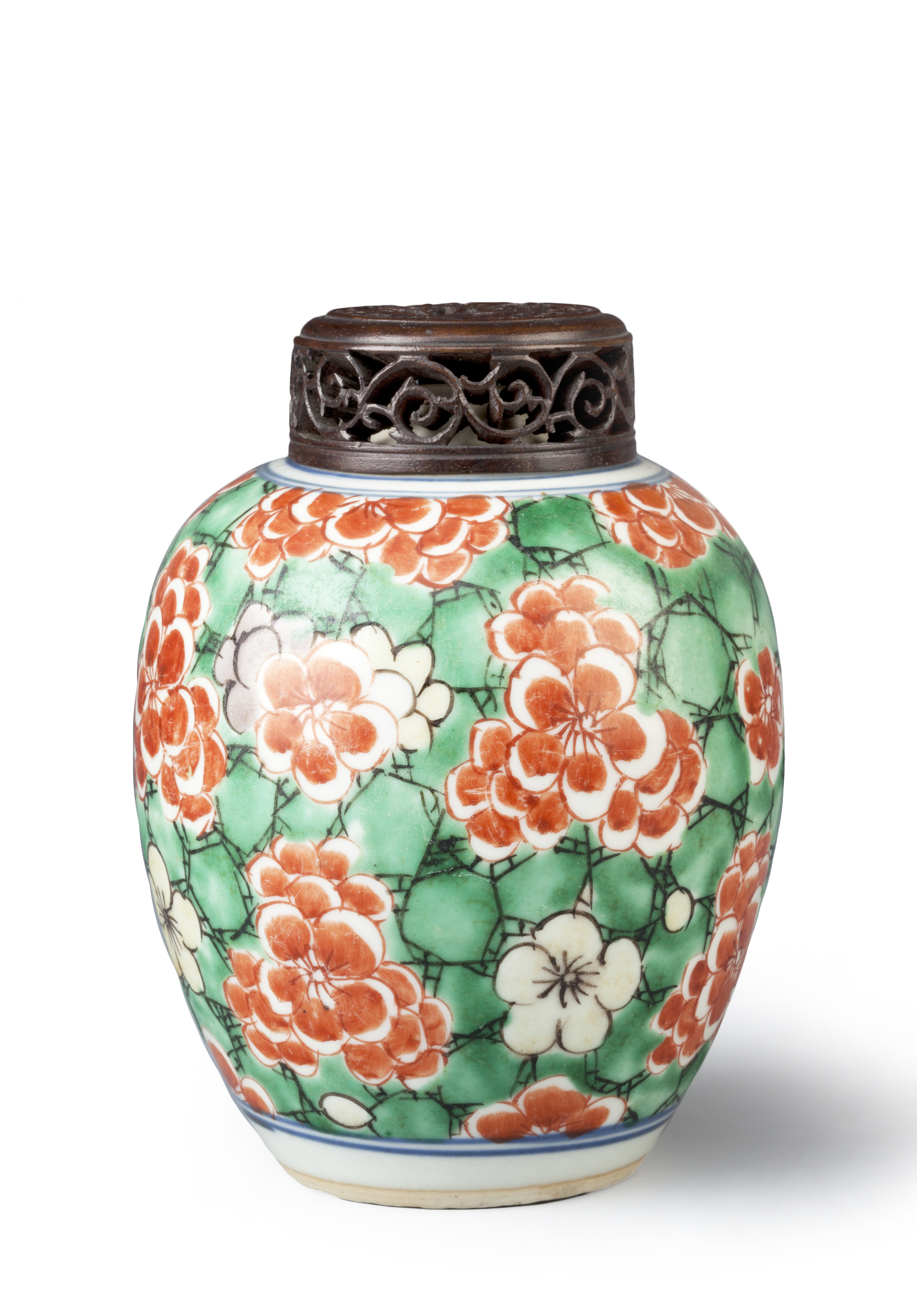 The ovoid body painted in iron-red, aubergine and yellow enamels with prunus on a green cracked-ice ground, together with a reticulated wood cover, 12cm. (2)