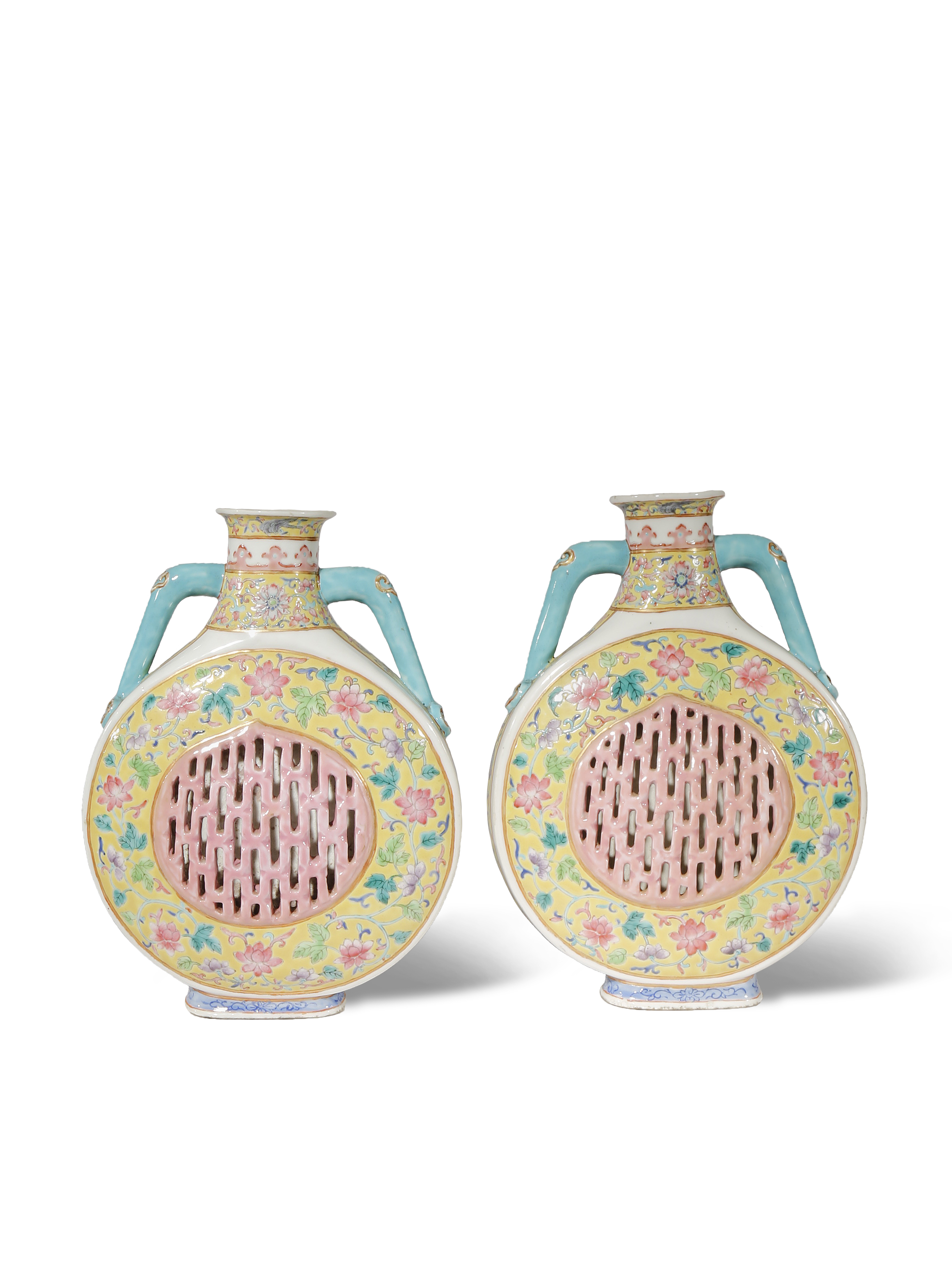 A PAIR OF CHINESE FAMILLE ROSE RETICULATED MOONFLASKS