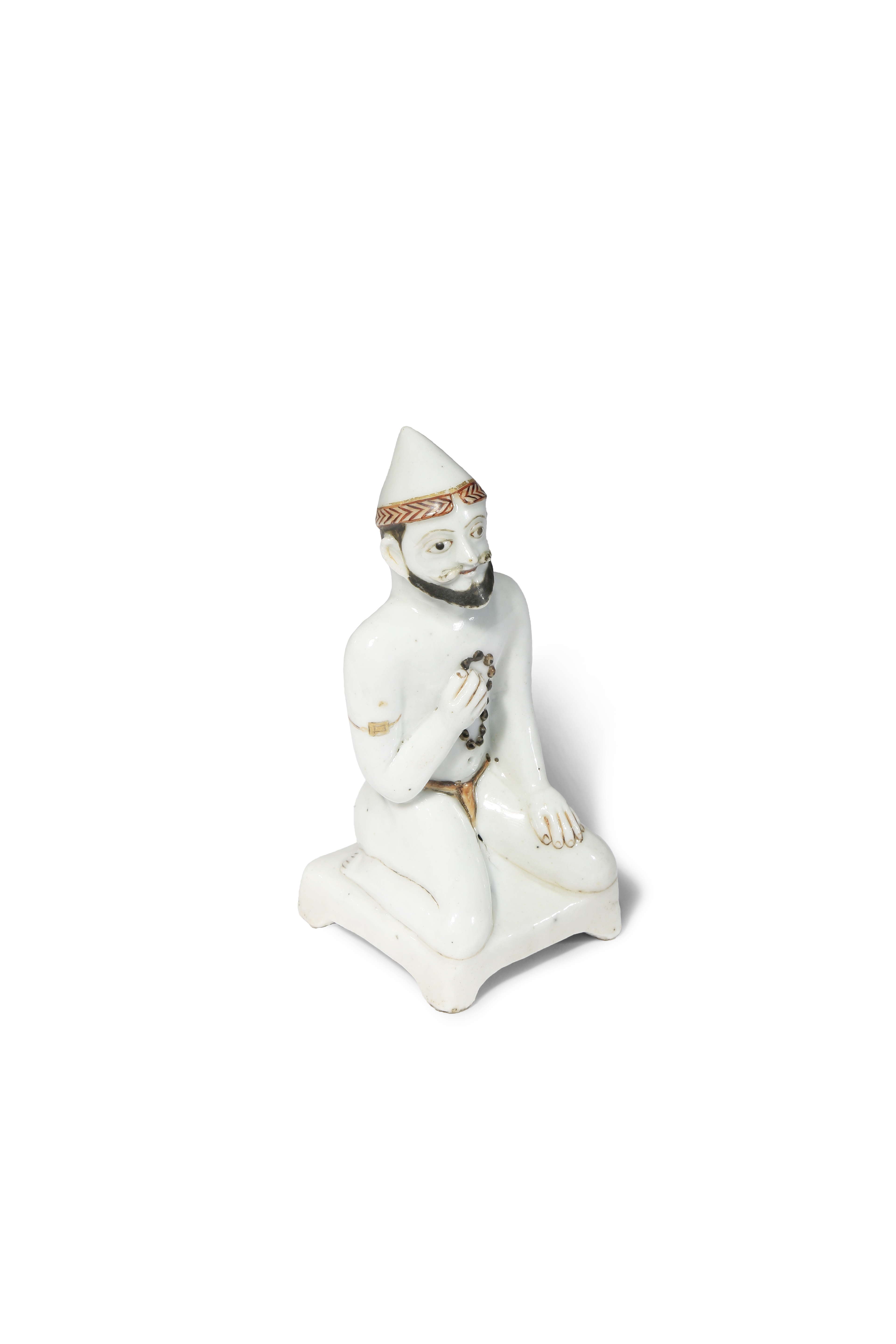 Possibly depicting a man from Southern Asia, the bearded figure kneels on a square cushion holding a string of beads to his chest, wearing a conical hat, a loincloth and an armband, with some areas painted in enamels and gilt, 10.2cm.