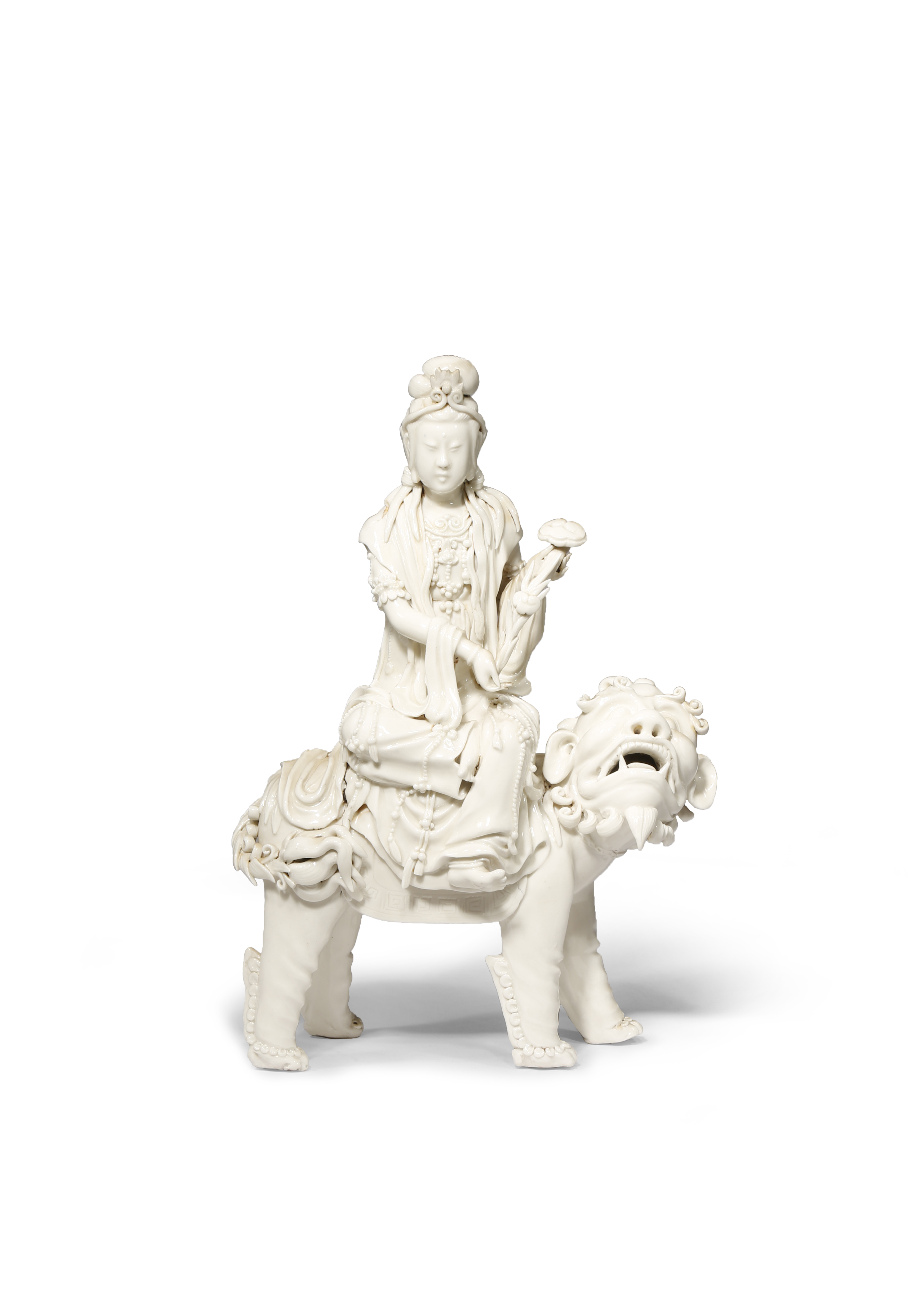 A CHINESE BLANC DE CHINE FIGURE OF GUANYIN AND A LION DOG