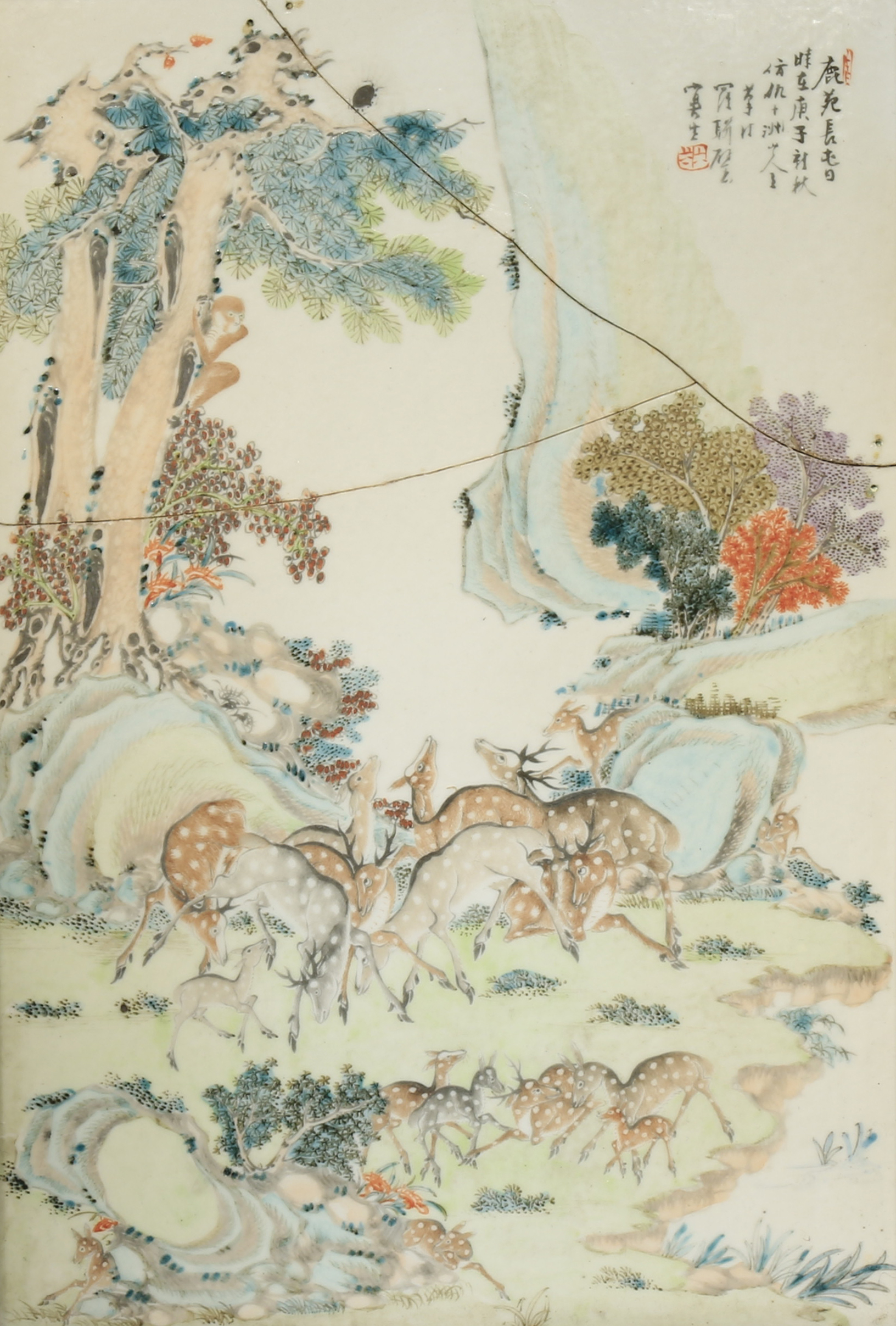 A CHINESE PORCELAIN PLAQUE LATE QING DYNASTY/REPUBLIC PERIOD Painted with a group of deer and...