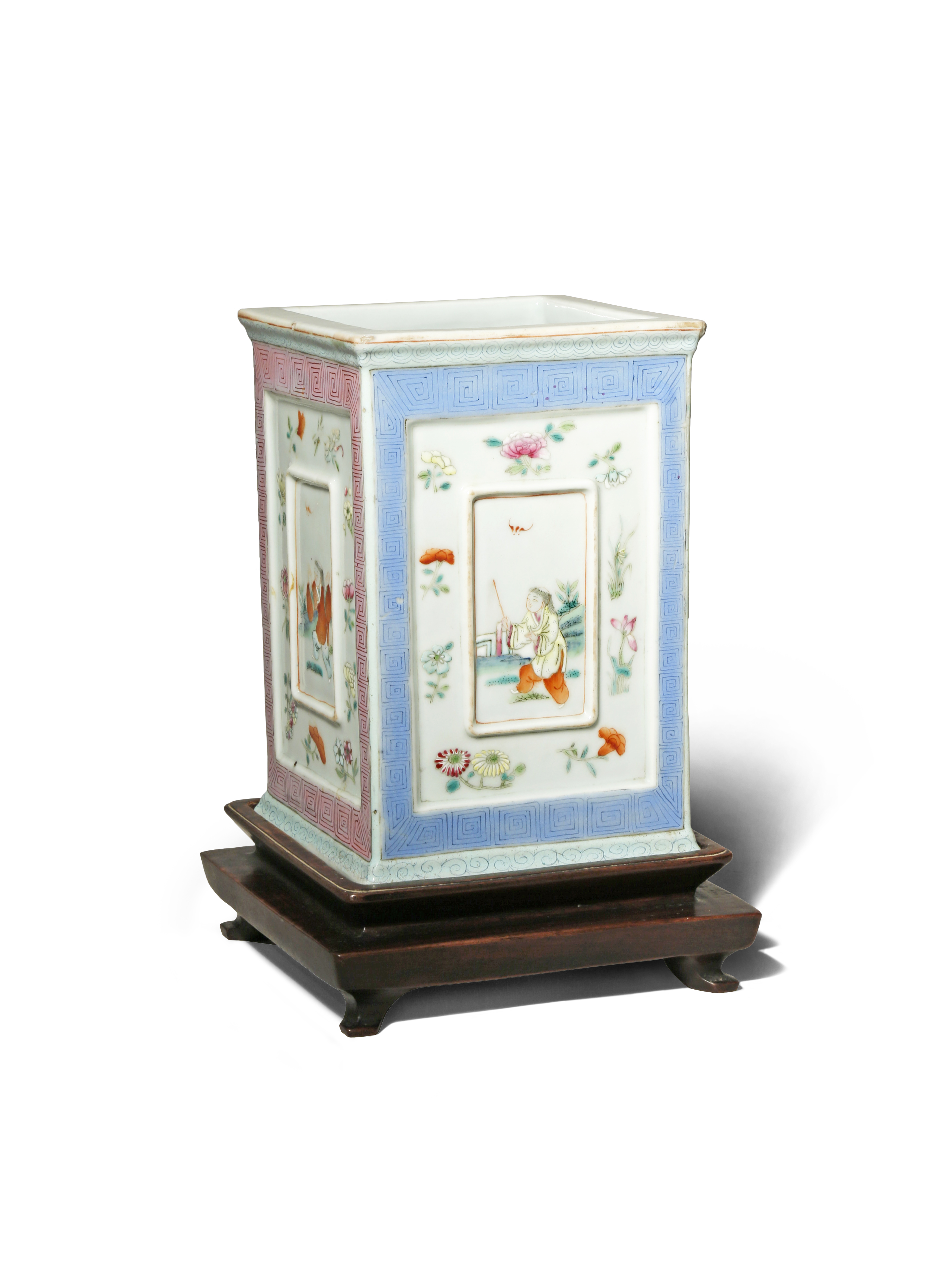 A CHINESE FAMILLE ROSE SQUARE-SECTION BITONG LATE QING DYNASTY Each side with a panel depicting a...
