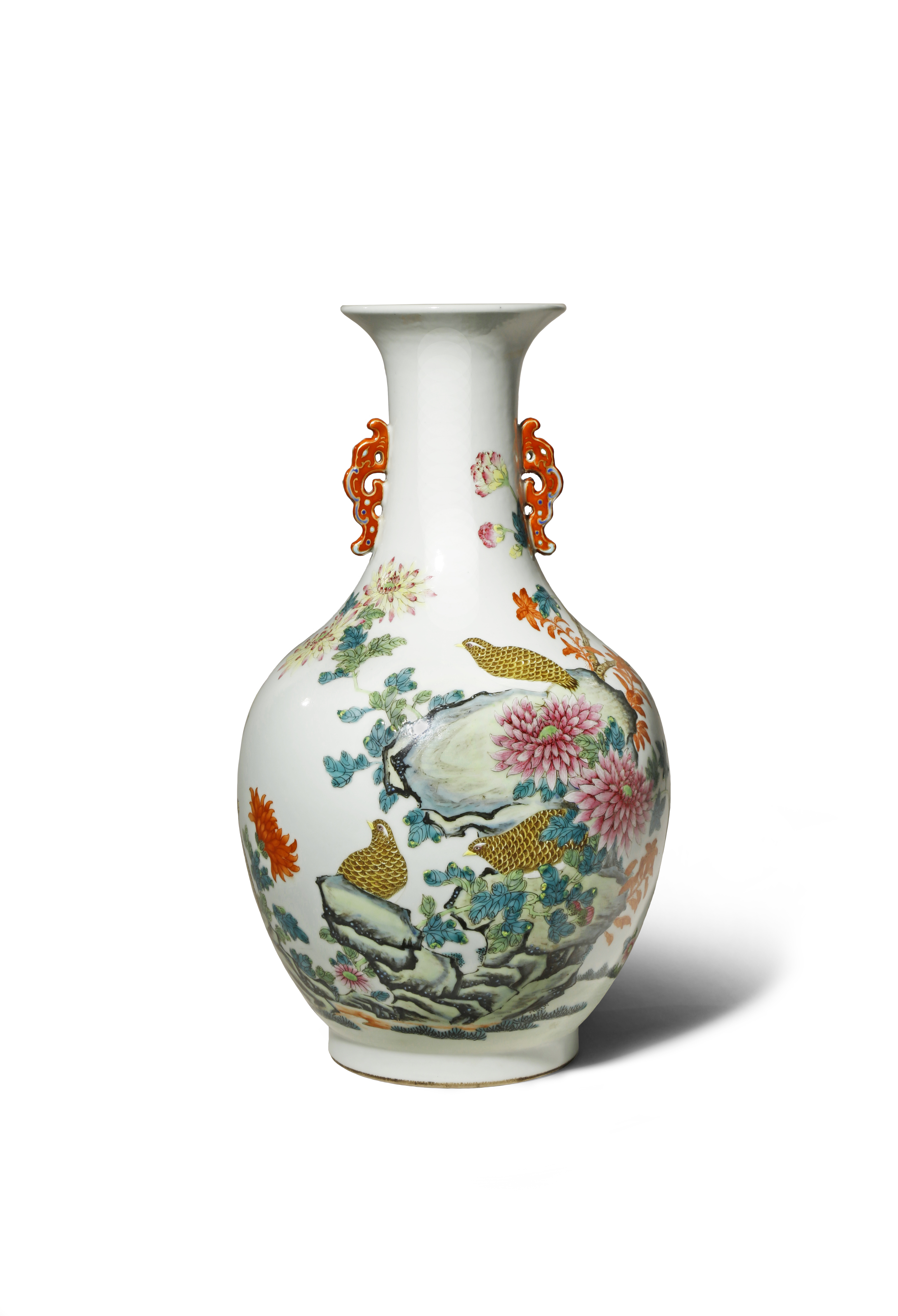 A CHINESE FAMILLE ROSE VASE 20TH CENTURY Painted with butterflies and quails amongst flowers and...