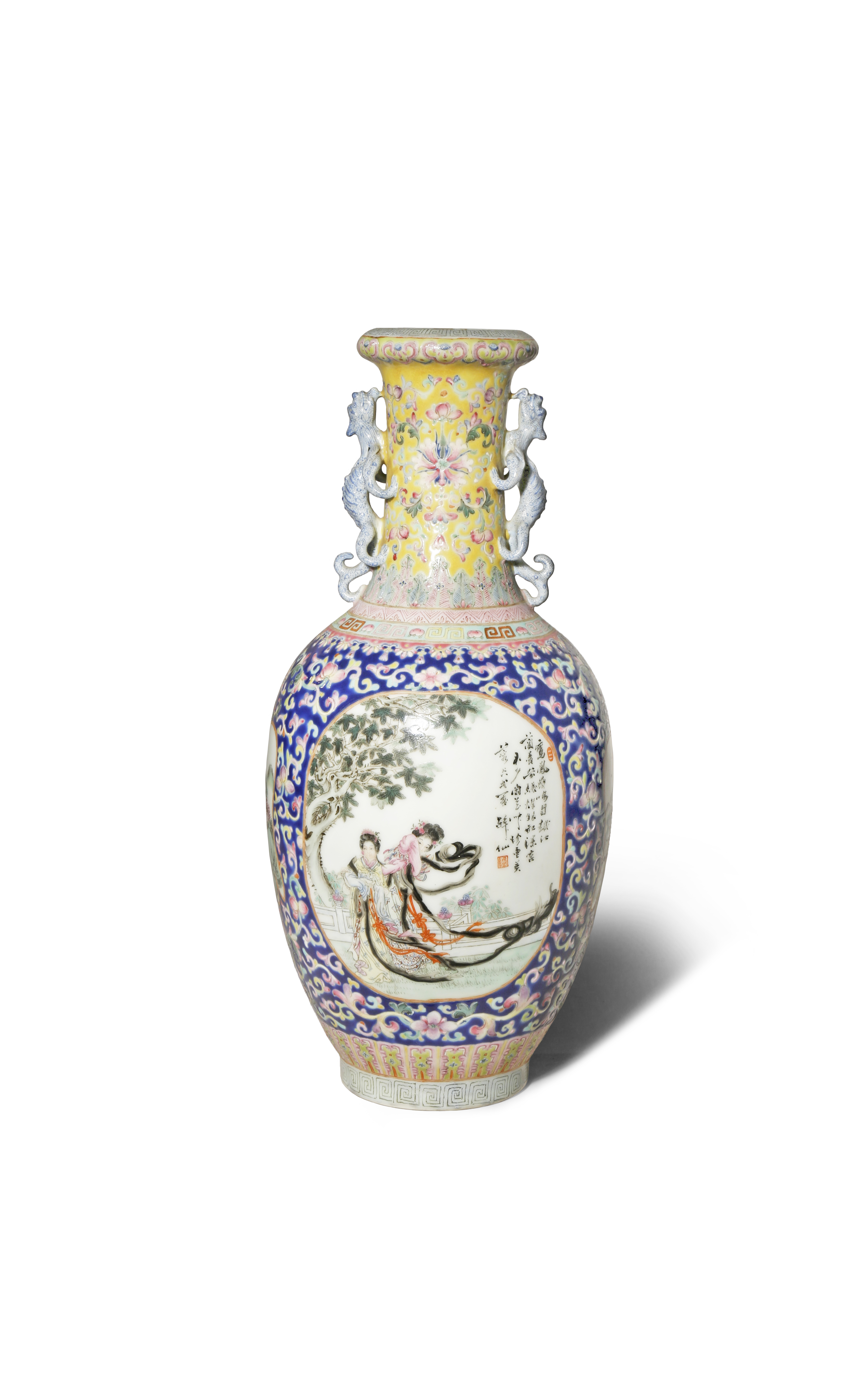 A CHINESE FAMILLE ROSE OVOID VASE REPUBLIC PERIOD Painted with two panels depicting beauties...