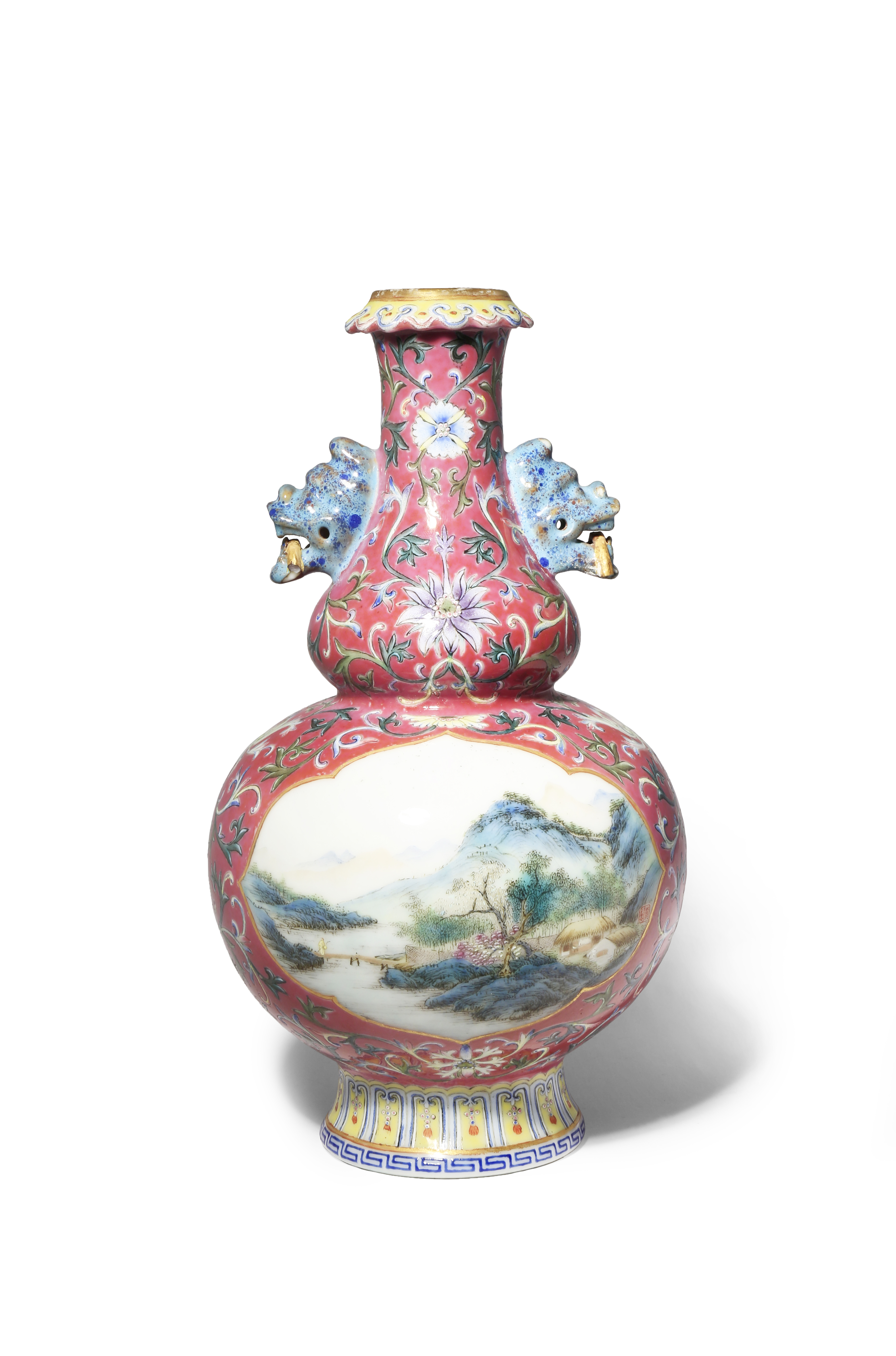 A CHINESE FAMILLE ROSE PINK-GROUND VASE REPUBLIC PERIOD With a gourd-shaped body supported on a...