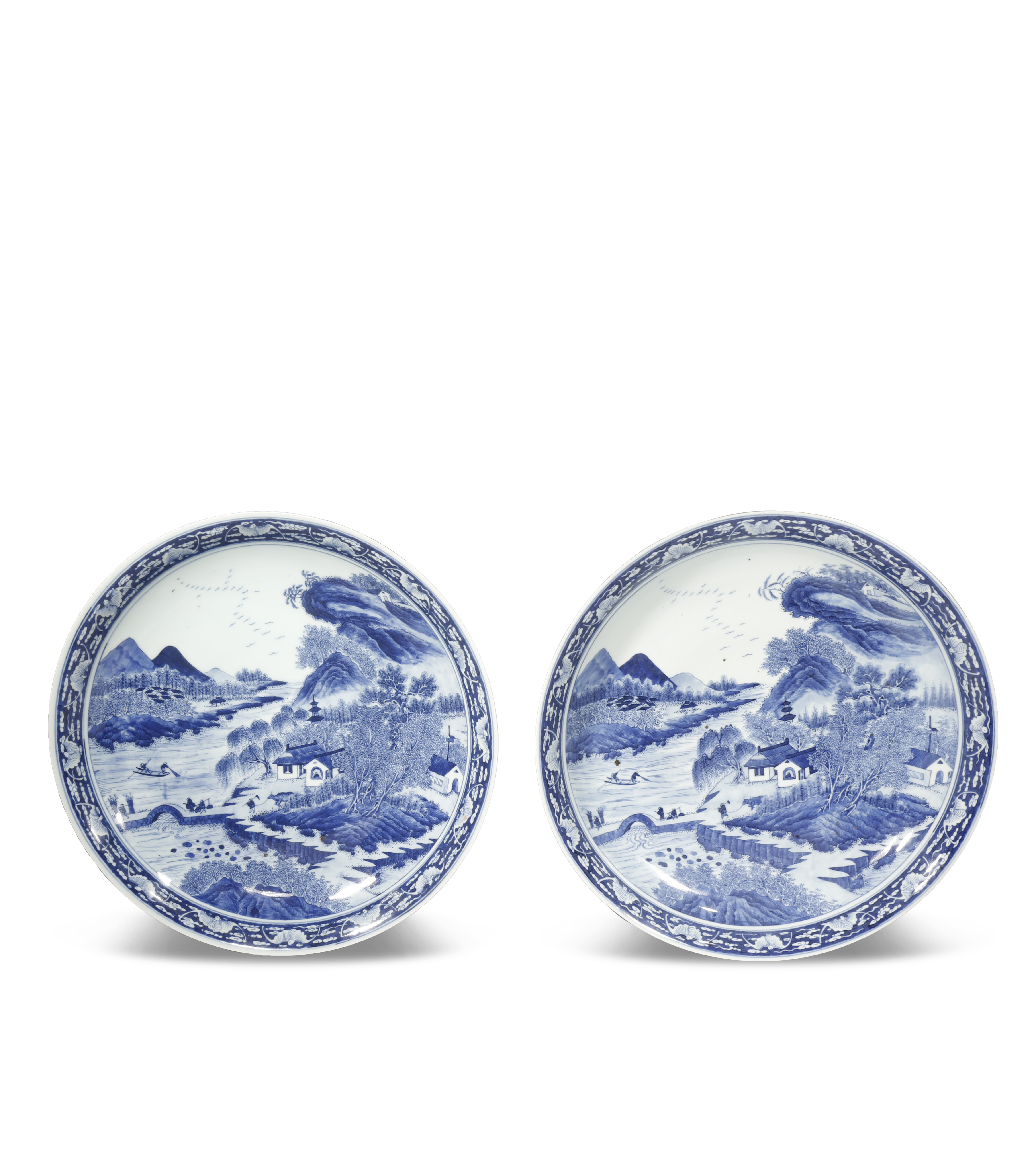 A PAIR OF CHINESE BLUE AND WHITE 'LANDSCAPE' DISHES 19TH CENTURY Each painted to the centre with...