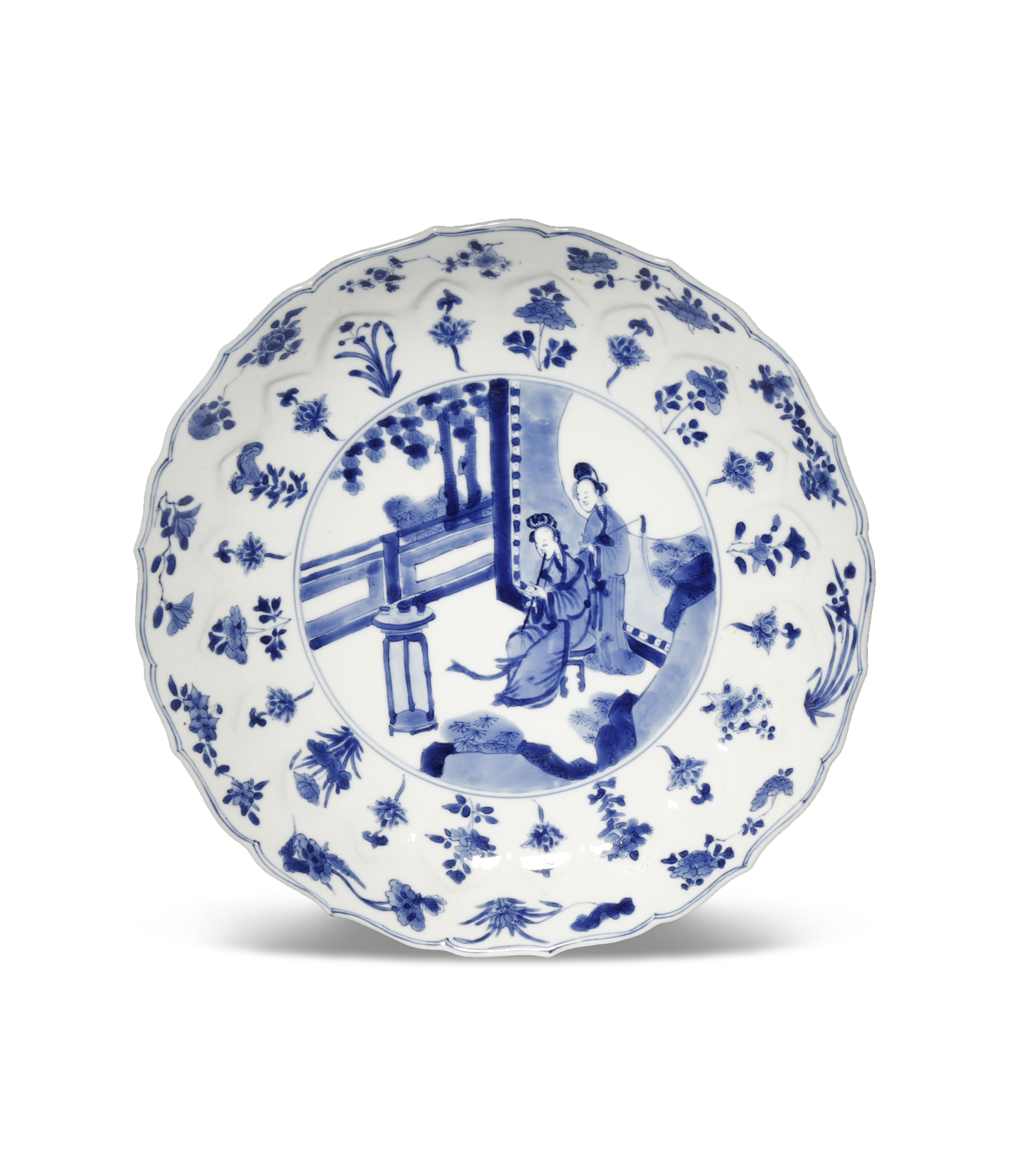Painted to the centre with a medallion depicting two beauties in a garden pavilion, all encircled by various flowerheads, with sprays of prunus, peony, magnolia and other blossoms to the rim, the reverse with similar floral designs, 26.5cm.