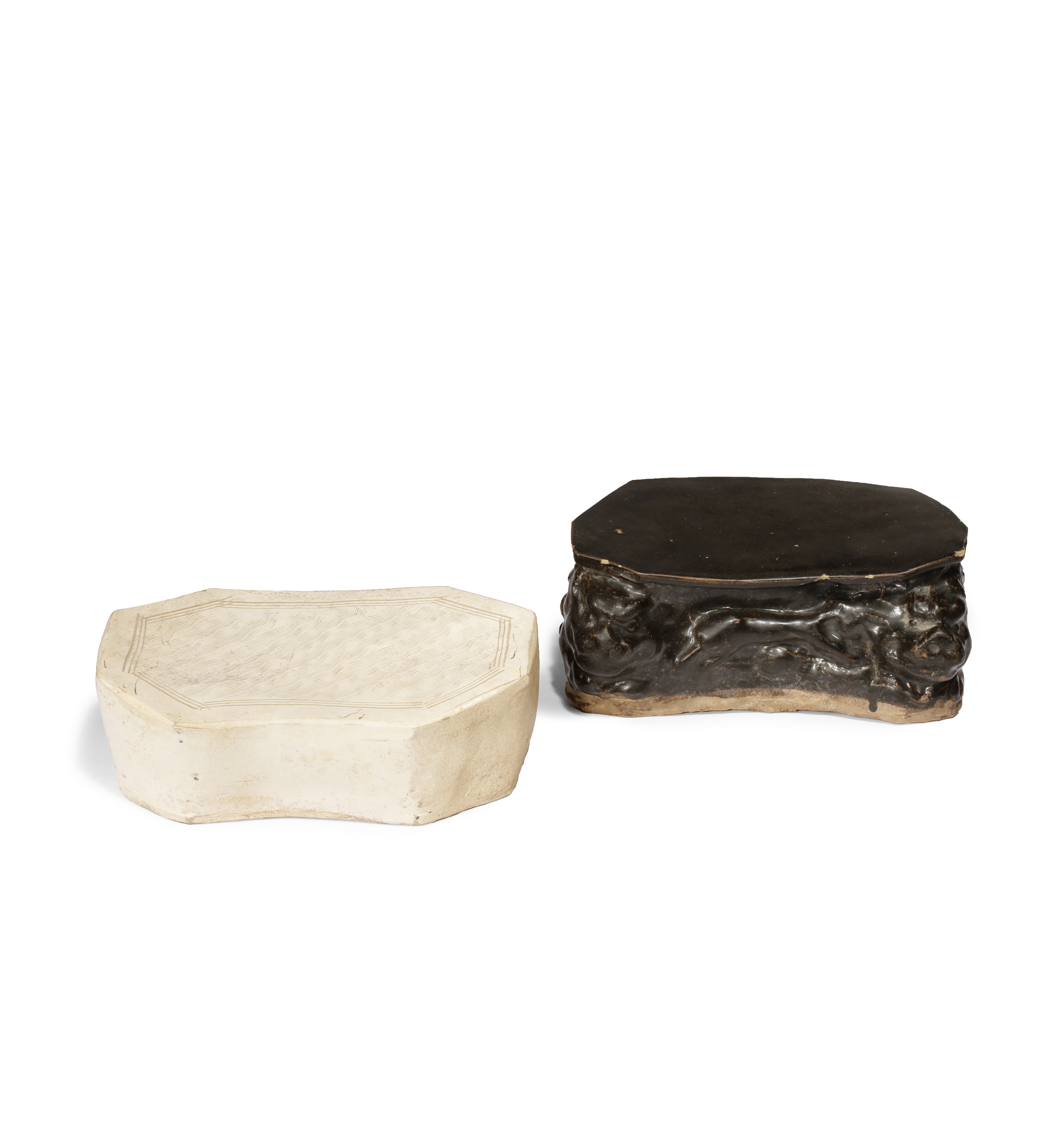 TWO CHINESE POTTERY PILLOWS SONG DYNASTY OR LATER One covered in a black-brown glaze and shaped...